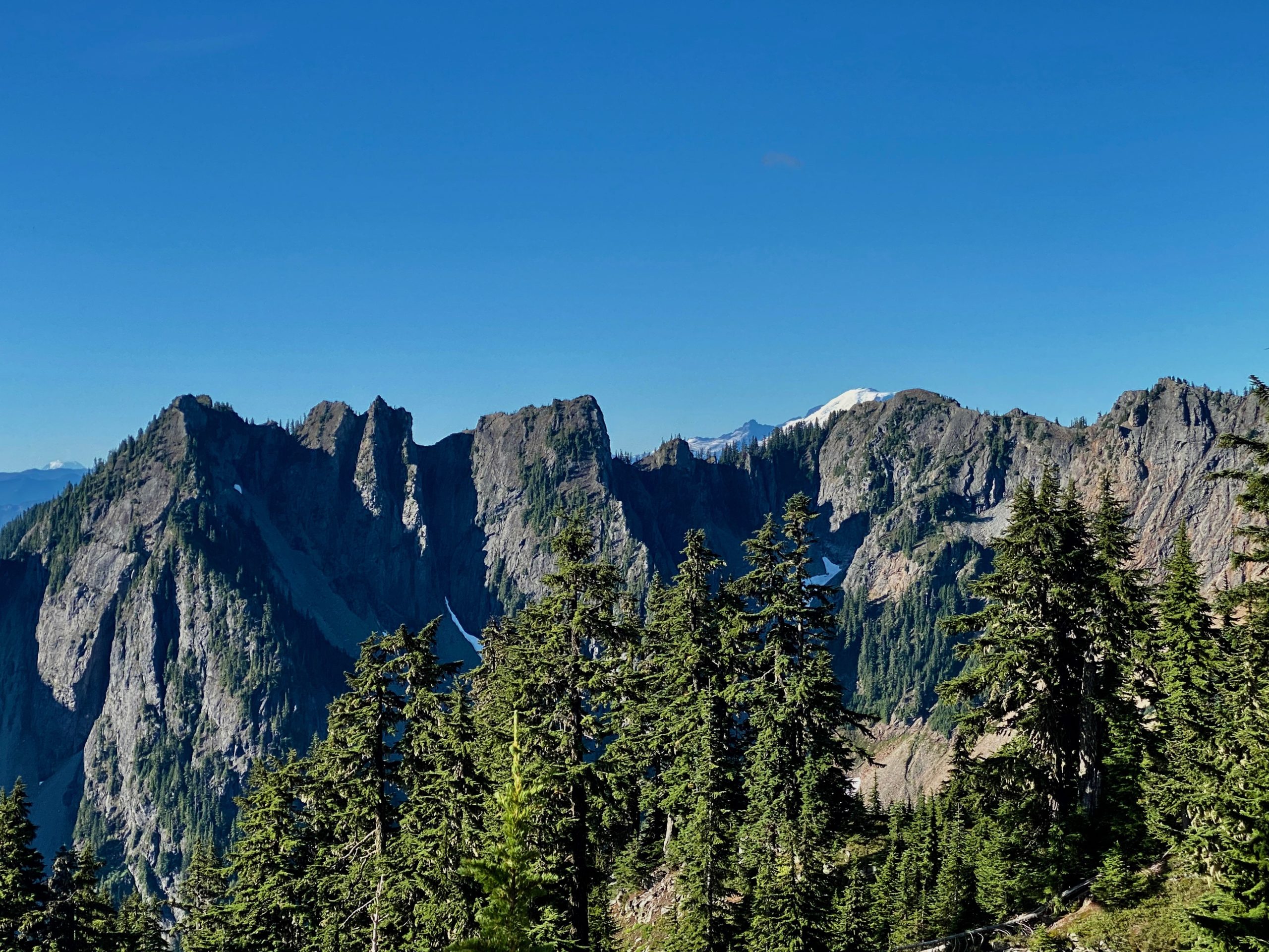 Mountains beyond mountains. Ahead looms the fortress-like cliffs of the Kendall Peak ridge complex. Beyond peeks glacier-covered Mt. Rainier. The truncated, flattened, open cone of Mt. St. Helens is visible just above the horizon line in the center on the far left. 8:53:12. Been moving slow as mud all morning, but feel myself beginning to speed up a tad. Well, for an out of shape, out of condition 61 yro fella, that is. And a former thruhiker to boot!