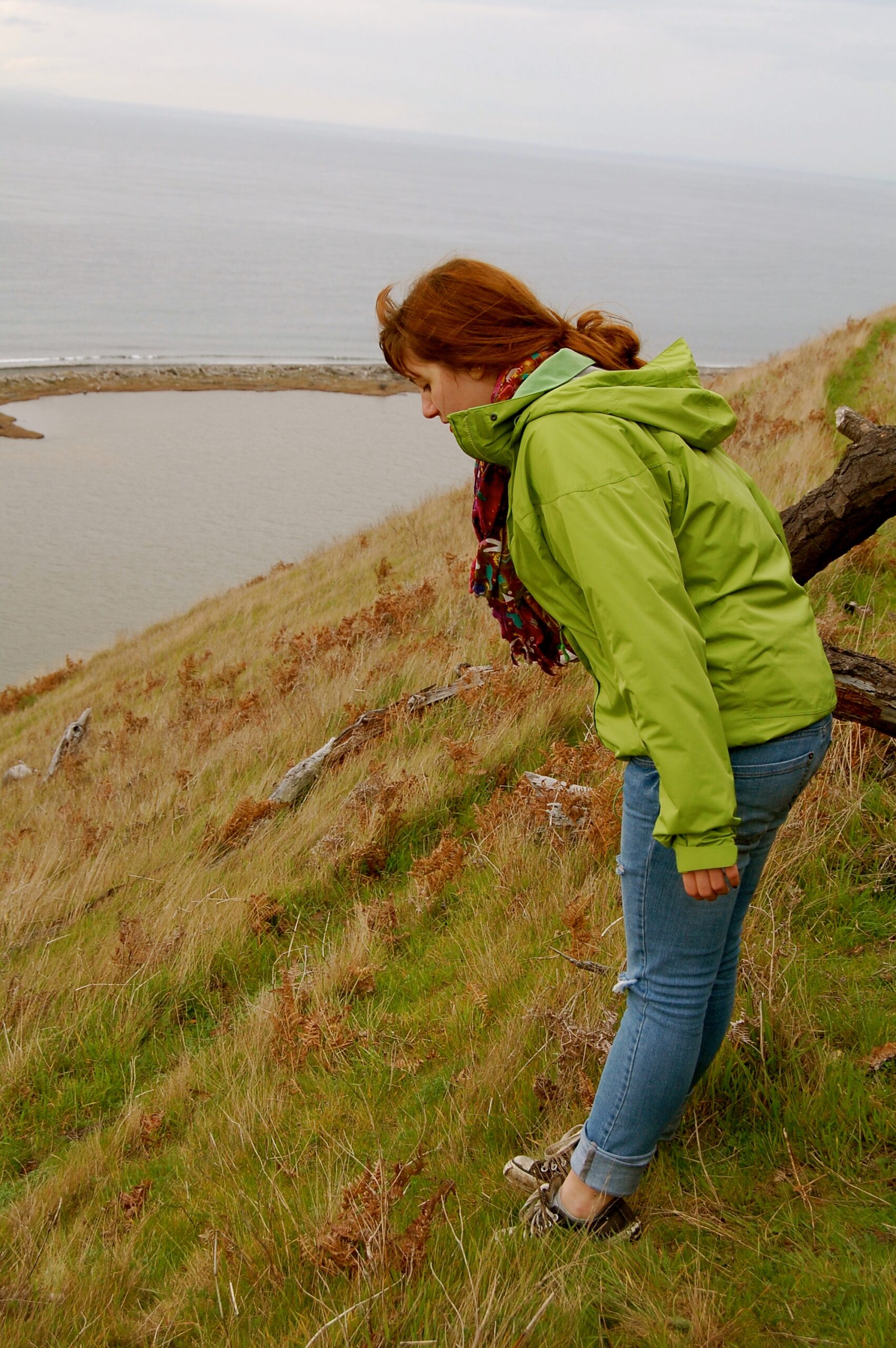 It’s a long ways down! While rolling down the hill like Jack ‘n’ Jill seems tempting, the long, steep grassy slopes usually continue on down to the beaches, in some places such as below us here these cliffs stop to drop 10 to 20 feet further or more over sheer cliffs onto rocks and logs.