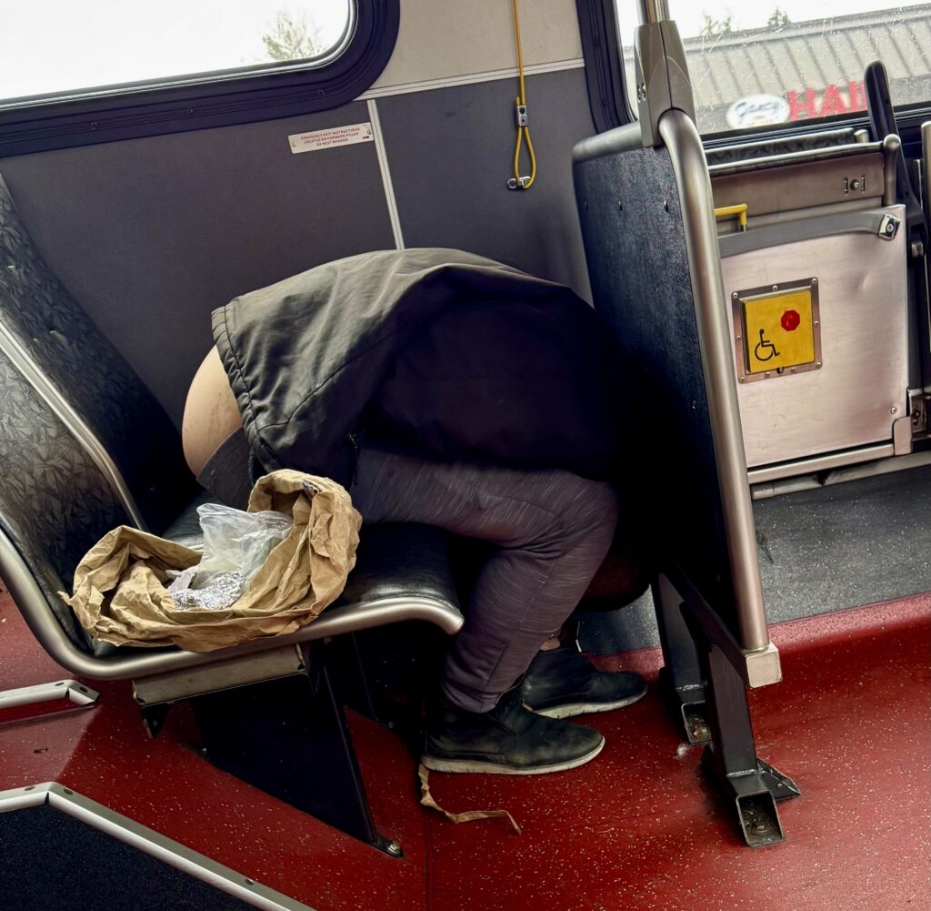 Fentanyl Man. Sitting on the Express bus. His head is way down just above his ankles. After I boarded the bus in South Shoreline, he was sitting halfway up in his seat. The man was weaving in place, nodding in and out, as he struggled to stay awake. Finally, inevitably, Fentanyl Man succumbed to the bliss of folding his body in half. Outside was late winter and a cold rain fell steady from low, gray clouds. The bus was cozy warm. Street traffic was light, and the bus wasn’t crowded. I was astounded, even alarmed, at how bent over the man was