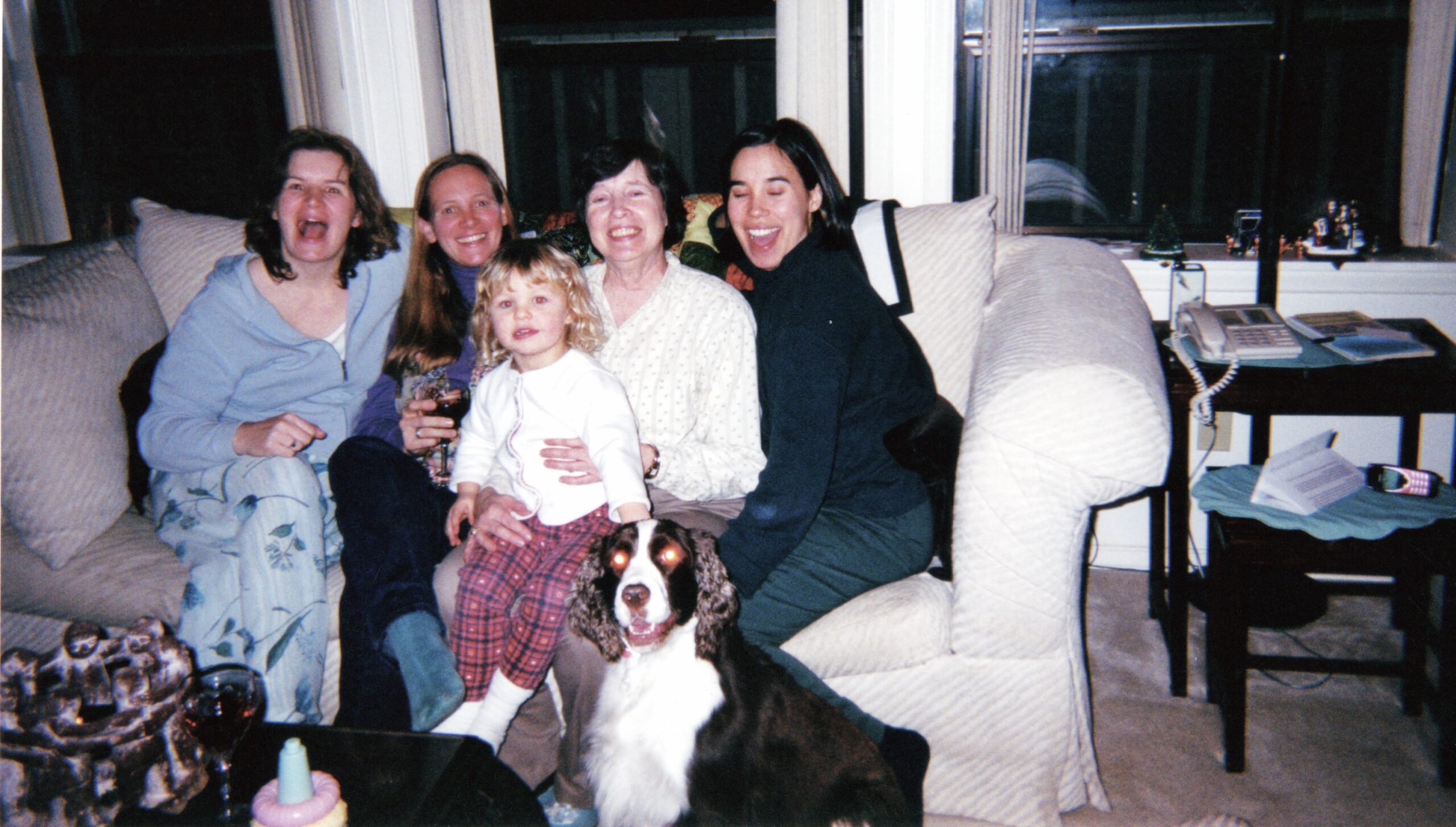 Having fun at Dragonfly East, formerly the Barn, in Bellevue. L2R: Kiki, Gwen, Kate, Jean (Kristina’s mom, holding Li’l Katie), & Kristina, pregnant with Talia. Jo sits at their feet. Tuesday 16 April 2002. Considered cropping out the furniture stuff in picture right, but check out the now-obsolete technology in use at the time.