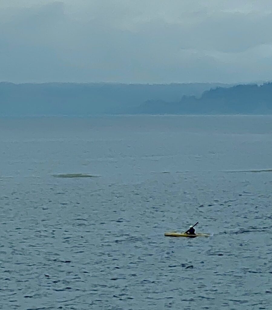 A lone kayaker paddles across the Sound as our ferry sails across the inland sea from Edmonds to Kingston. One thing I love about the Olympics is the journey to get there.