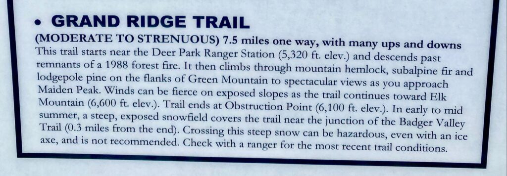 On the map, the Grand Ridge Trail is labeled the Deer Park Trail, which is what Edan & I call it from longago trips.