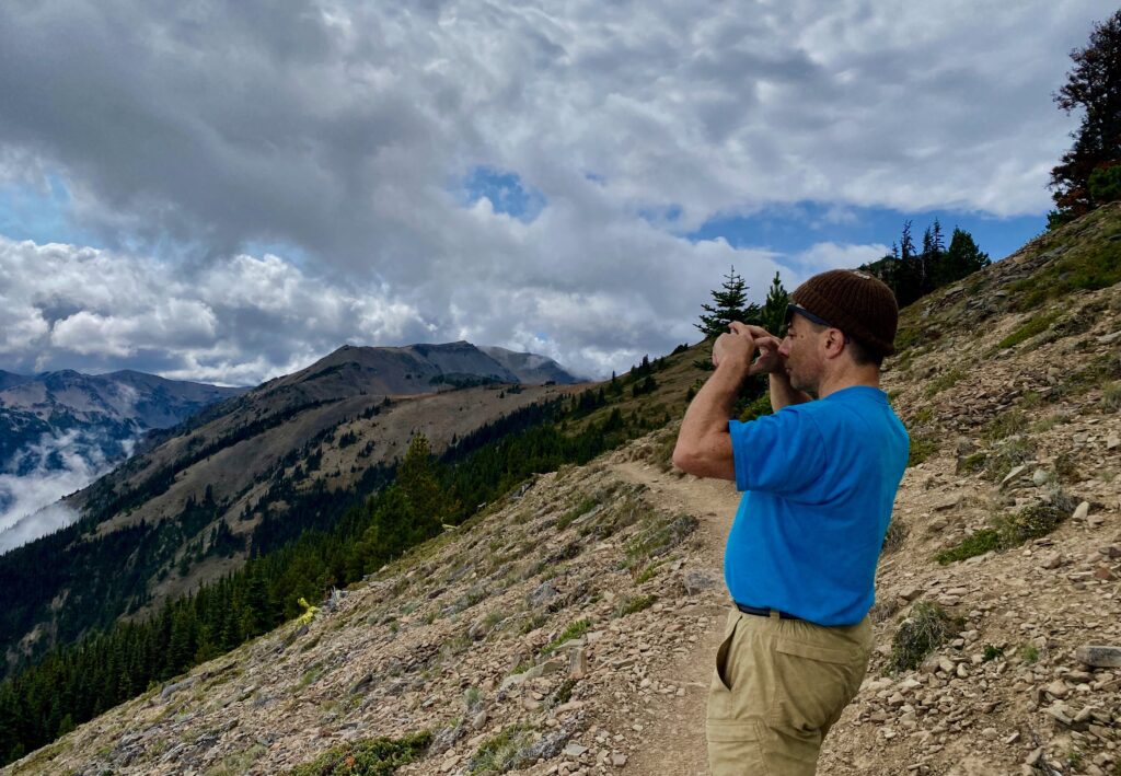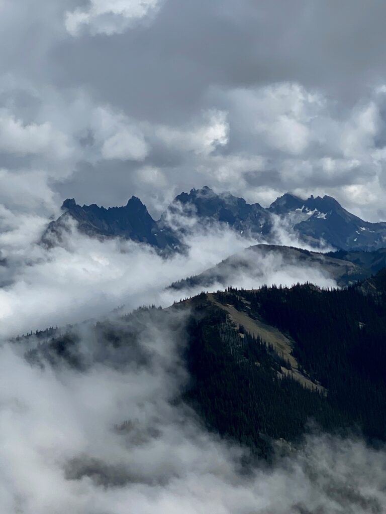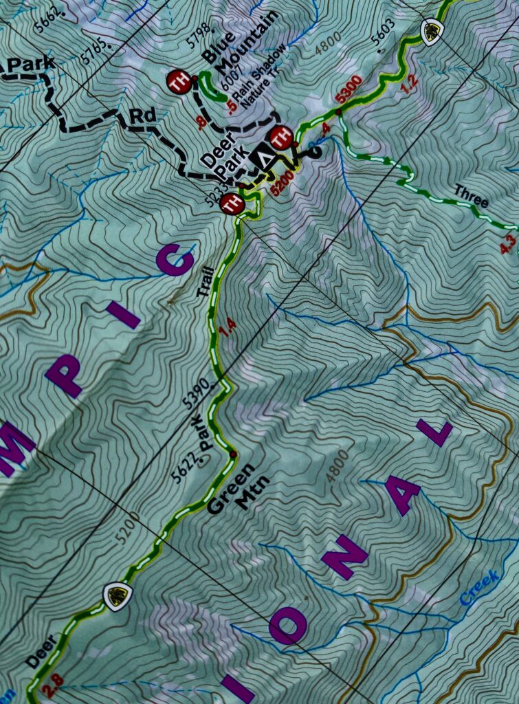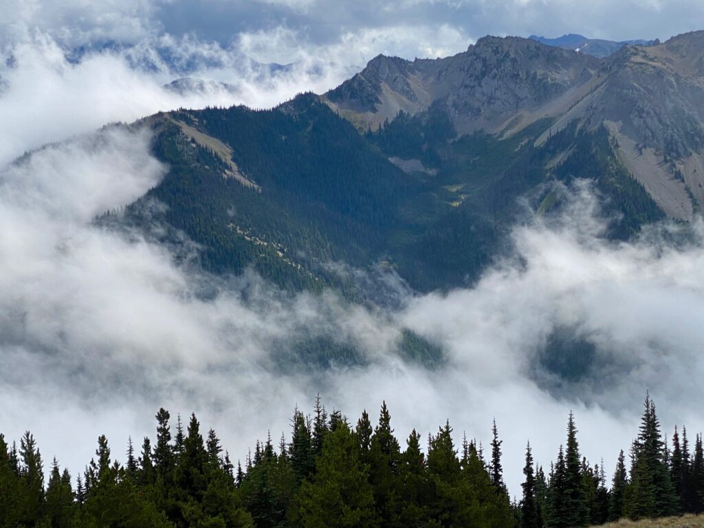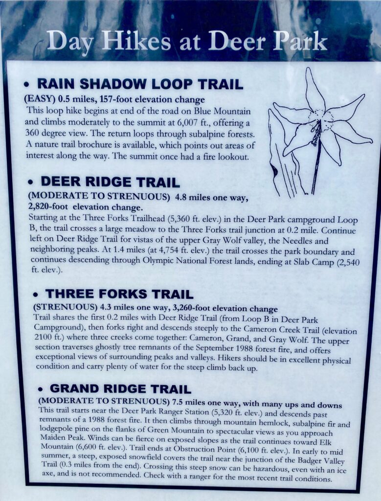 After winding around the Kitsap and across the Olympic Peninsulas, we drive up the 18-mile long Deer Park Road. The last half is treacherous at times, steep, curvy, and grabs one’s attention. We finally arrived in Deer Park and stop at a trail junction to get our bearings. We haven’t been here in years. Certainly over a decade ago.