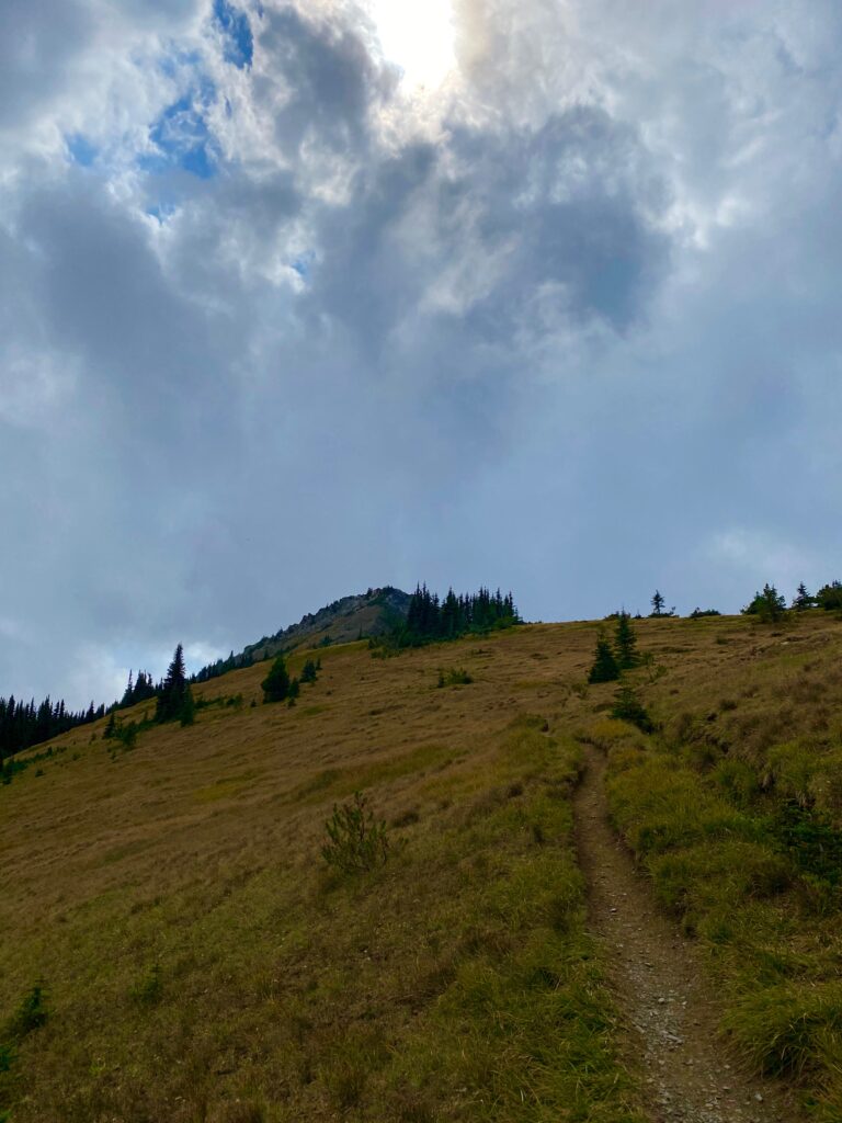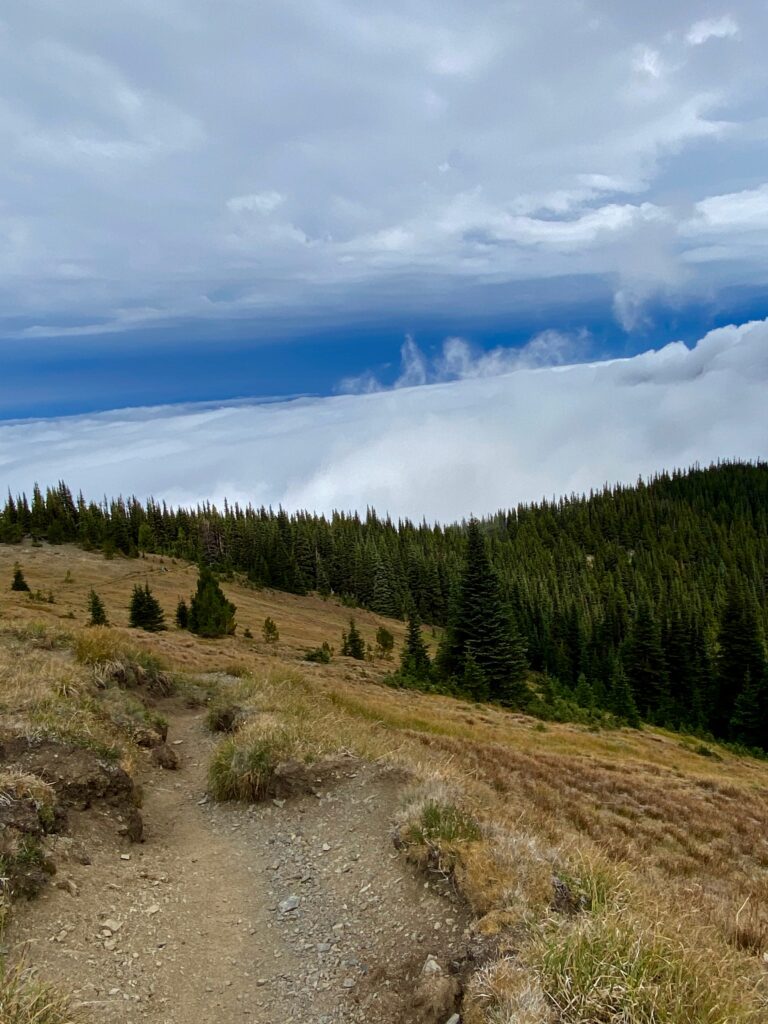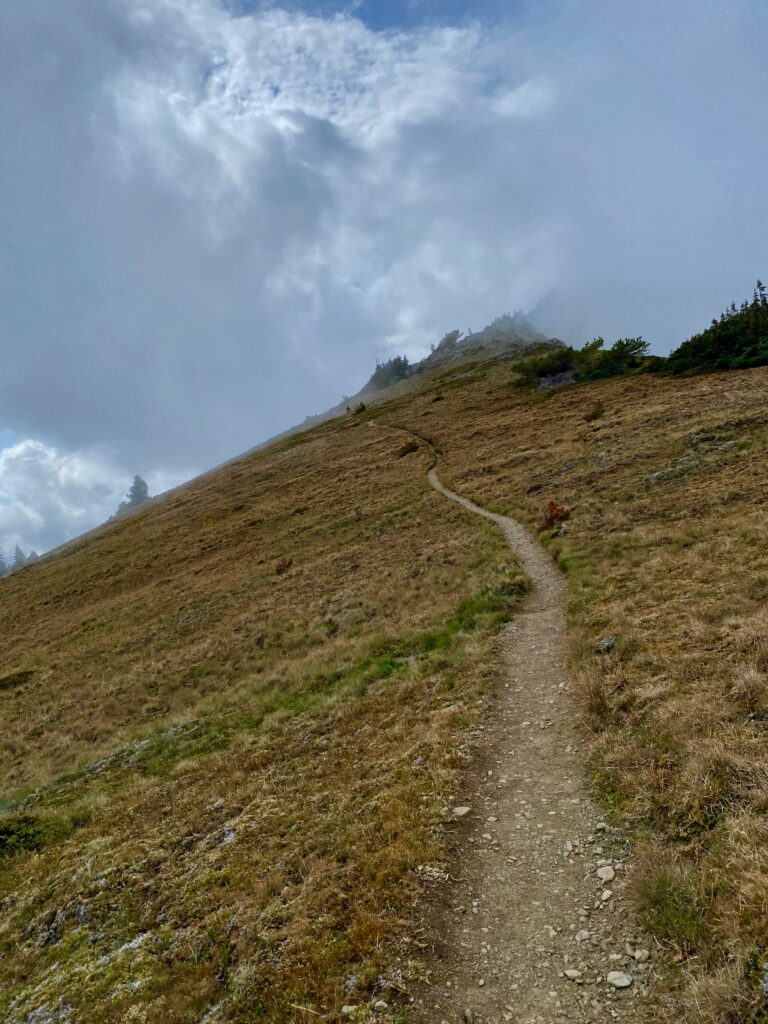 The trail beckons one onwards into the edge of the sky. Here the Grand Ridge Trail, often called the Deer Park Trail, traverses the slopes of Maiden Peak in Olympic National Park.