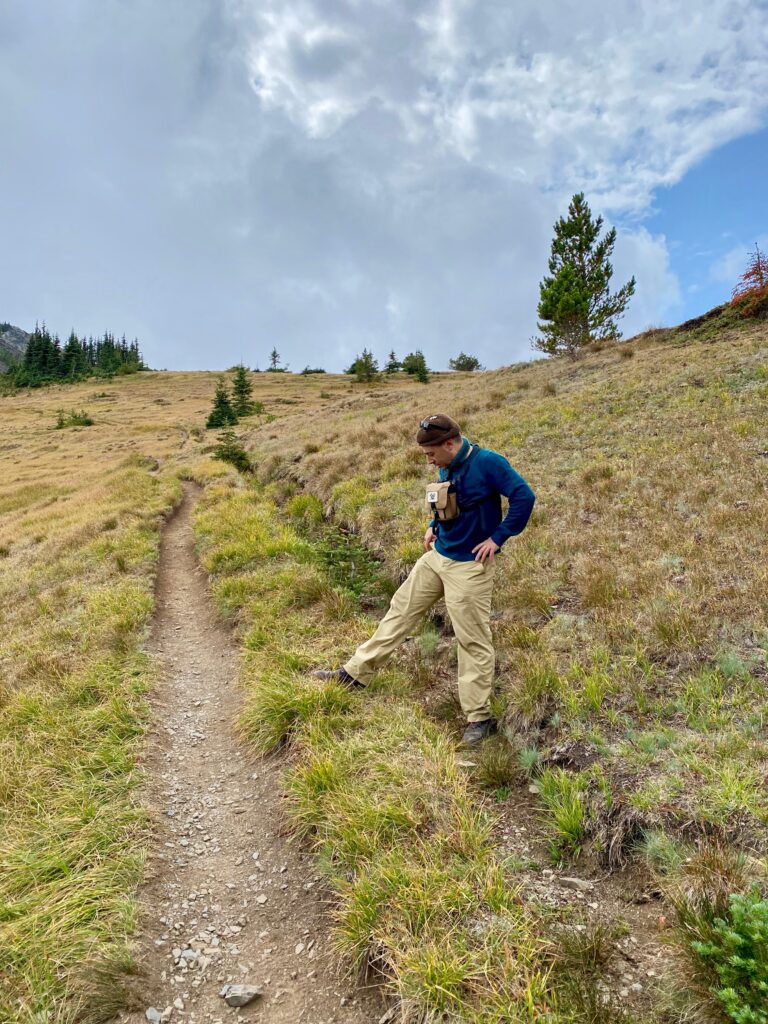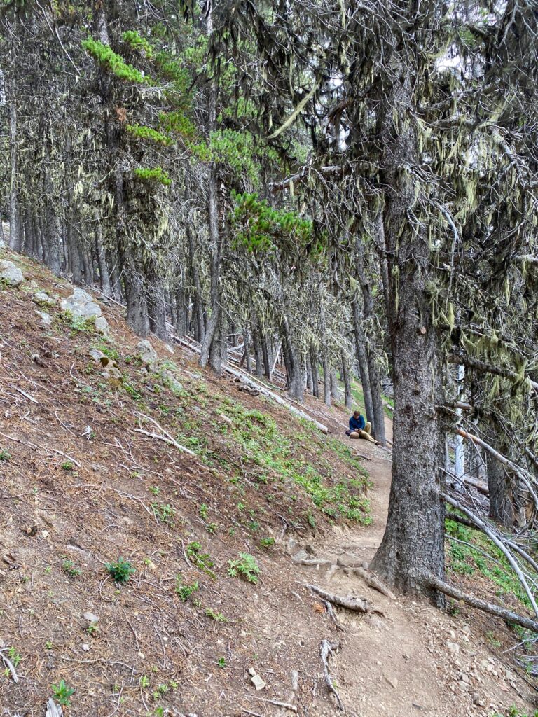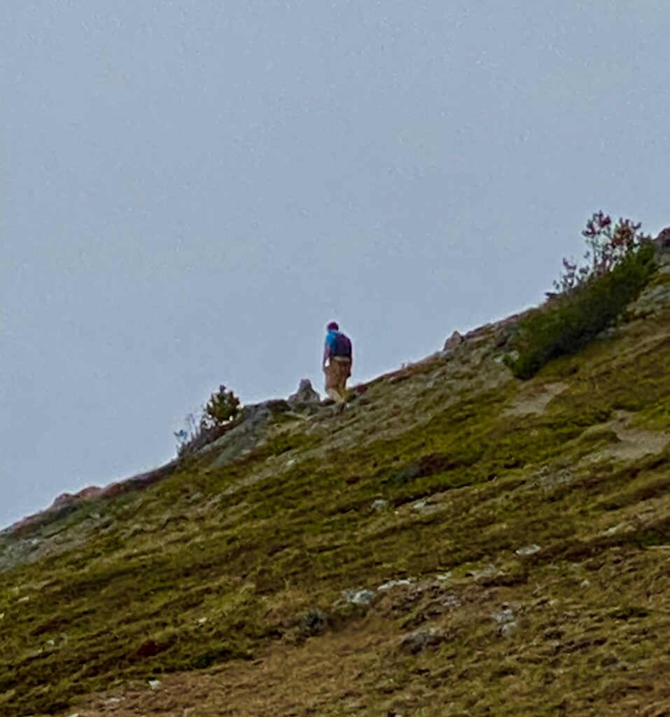 Edan’s gone around the bend and is outa sight. The trail weaves down from Maiden Peak to cruise along the ridges of Elk Mountain. Eventually the Grand Ridge/Deer Park Trail ends at a TH junction on Obstruction Peak to connect with other trails into the interior and the dirt road back to Hurricane Ridge. Edan doesn’t go much further. He turns around down there and comes back with the group of men from across Europe.