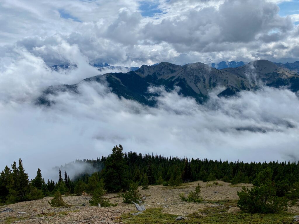 Video 8: Looks wet and stormy down in those valleys! Hard to identify mountain peaks in all these clouds, but we’re looking at the Gray Wolf Ridge & the Needles from Greywolf Mountain to Mt. Deception. Yuppers, both “Gray” & “Grey” are used on the same maps.