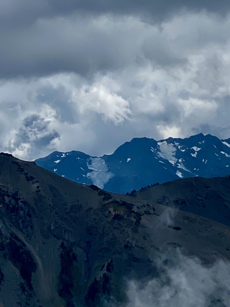 In the distance the skies clear enough to see a few remnant glaciers on those mountains. Climate change is naked.