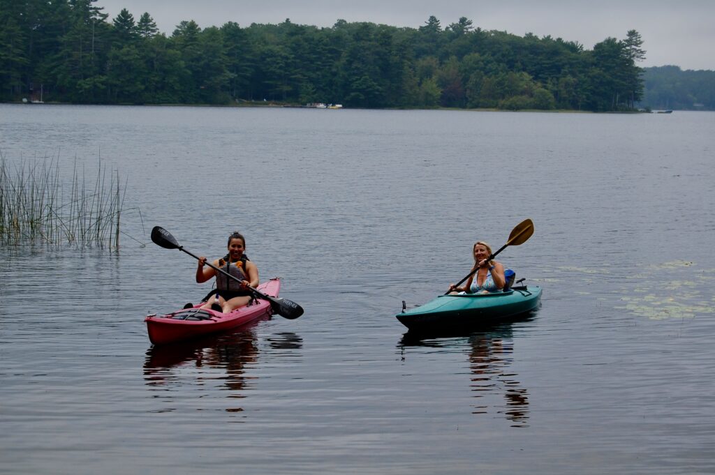 The energetic excitement of the first few days has turned with the shortening days to a mellow sadness, sad we Familymooners will soon leave to go home when we already feel at home here at Crawford Pond. So we enjoy the day and the time we have left in the here-now of present moments. Here my wife and her good friend paddle one last time together out on the lake. We’re forever grateful to Andrea and her sons for sharing their Little Red Cottage and a week out of their busy lives with us Washingtonians.