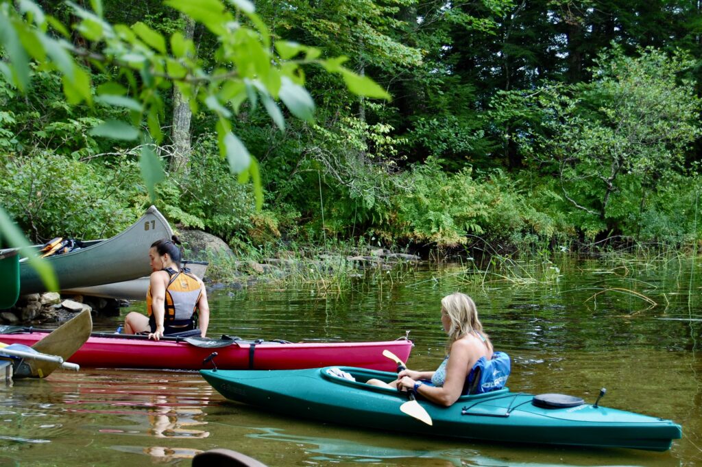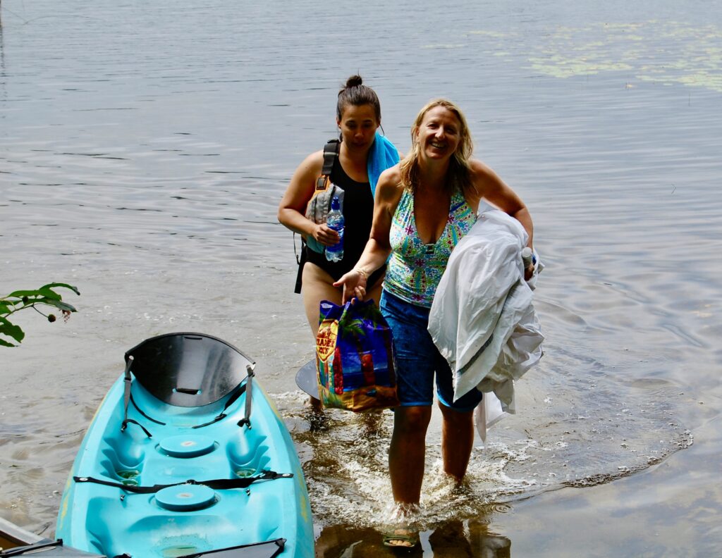 Morgan & Talia chatting with Andrea as she shoves off in her lake kayak.