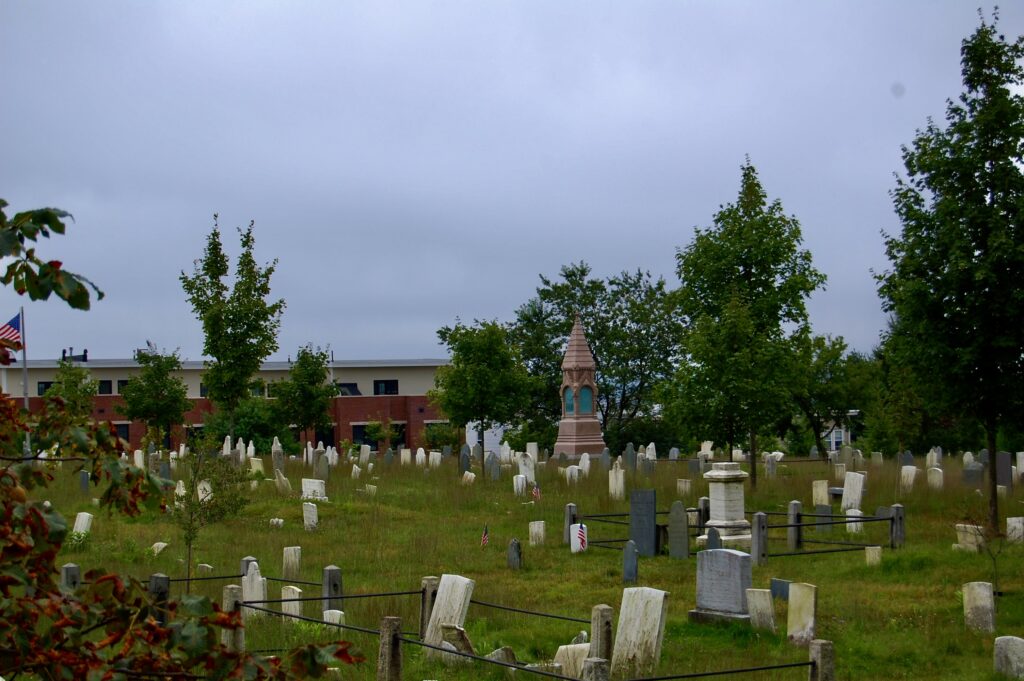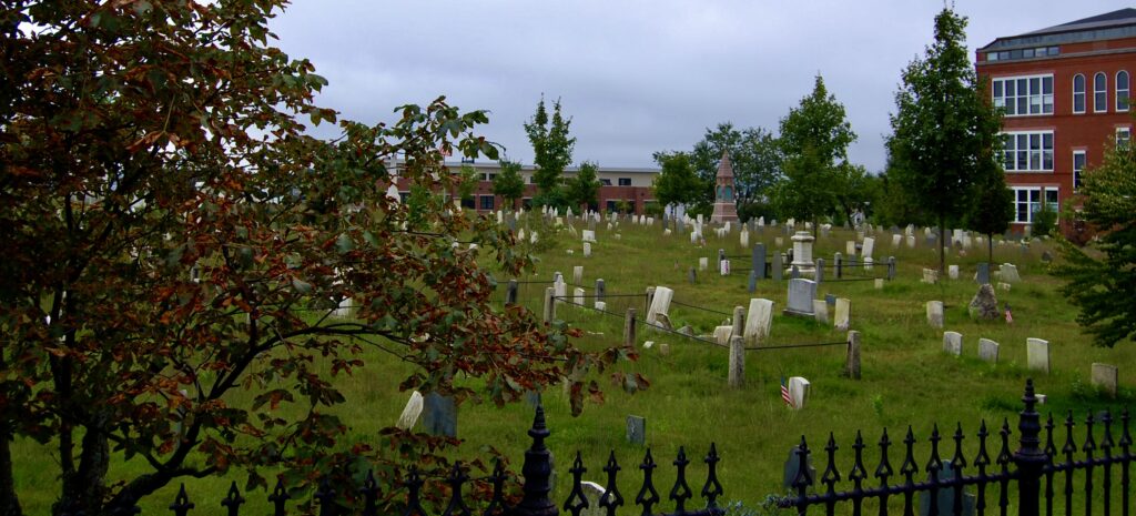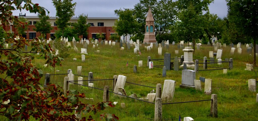 We’re at the famous old Eastern Cemetery in Portland. British Colonials established it back in 1668. By the way, Maine remained part of Massachusetts until it broke away to become its own state in 1820 following a 35 year long quarrel over the abolition of slavery. The 1820 Missouri Compromise required an even number of free and slave states. While Massachusetts was a Federalist Party stronghold, what became Maine was the bastion of local semi-autonomous townships and once-landless farmers who moved there after the American Revolution. The majority of Mainers back then supported the Democrat-Republican Party with its mix of liberalism, ruralism, decentralization, and fierce abolitionism.