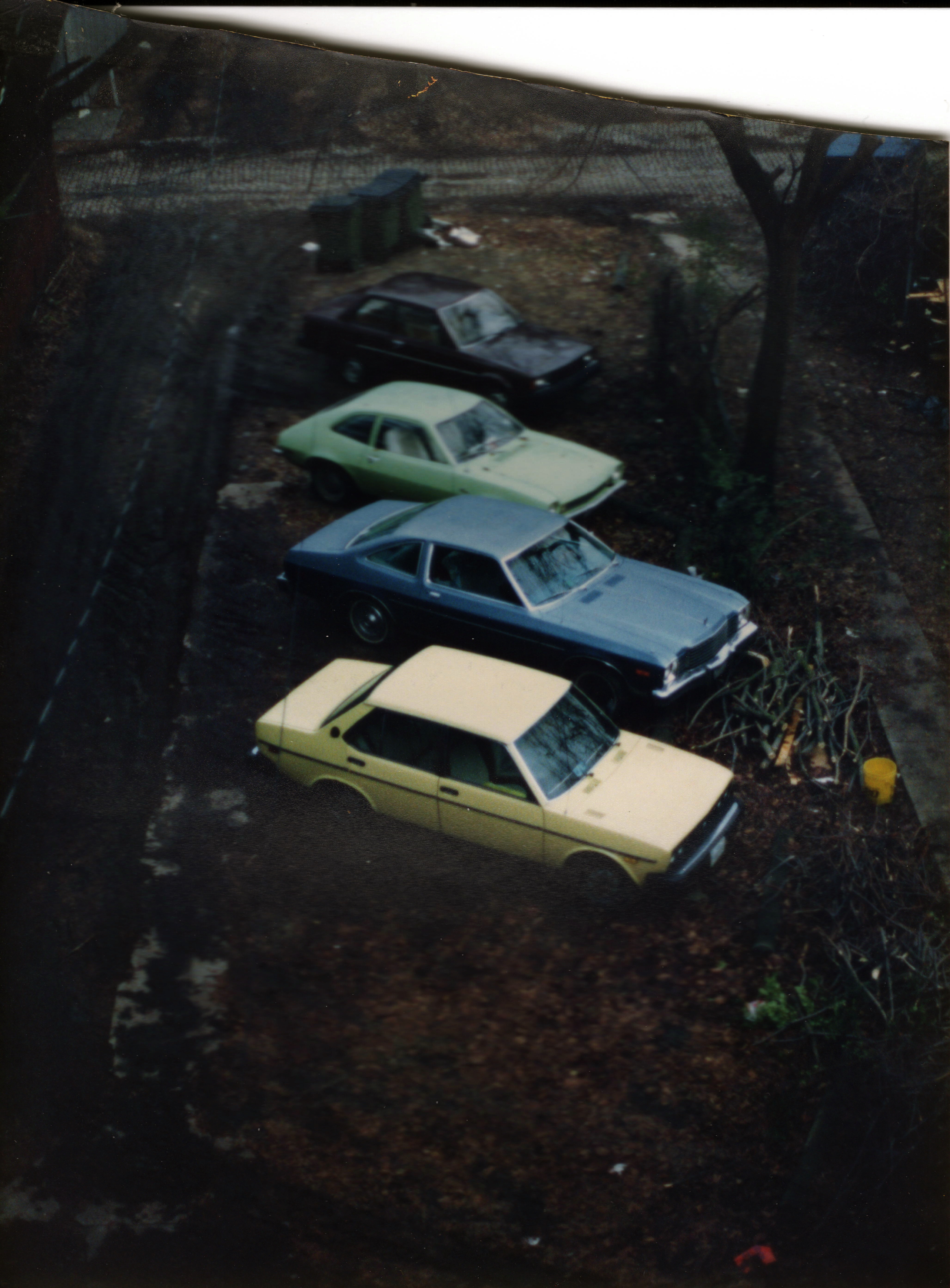 Cars parked out back of our Grove Avenue row house in the Alley of Mud. The blue car in the middle is mine with the kayak racks removed. It was my 1st ex-wife’s Margaret’s Dodge Aspen before she ran off with old Grizzly Gary, but that’s a wild story full of drama for yet another time. Fall 1986.