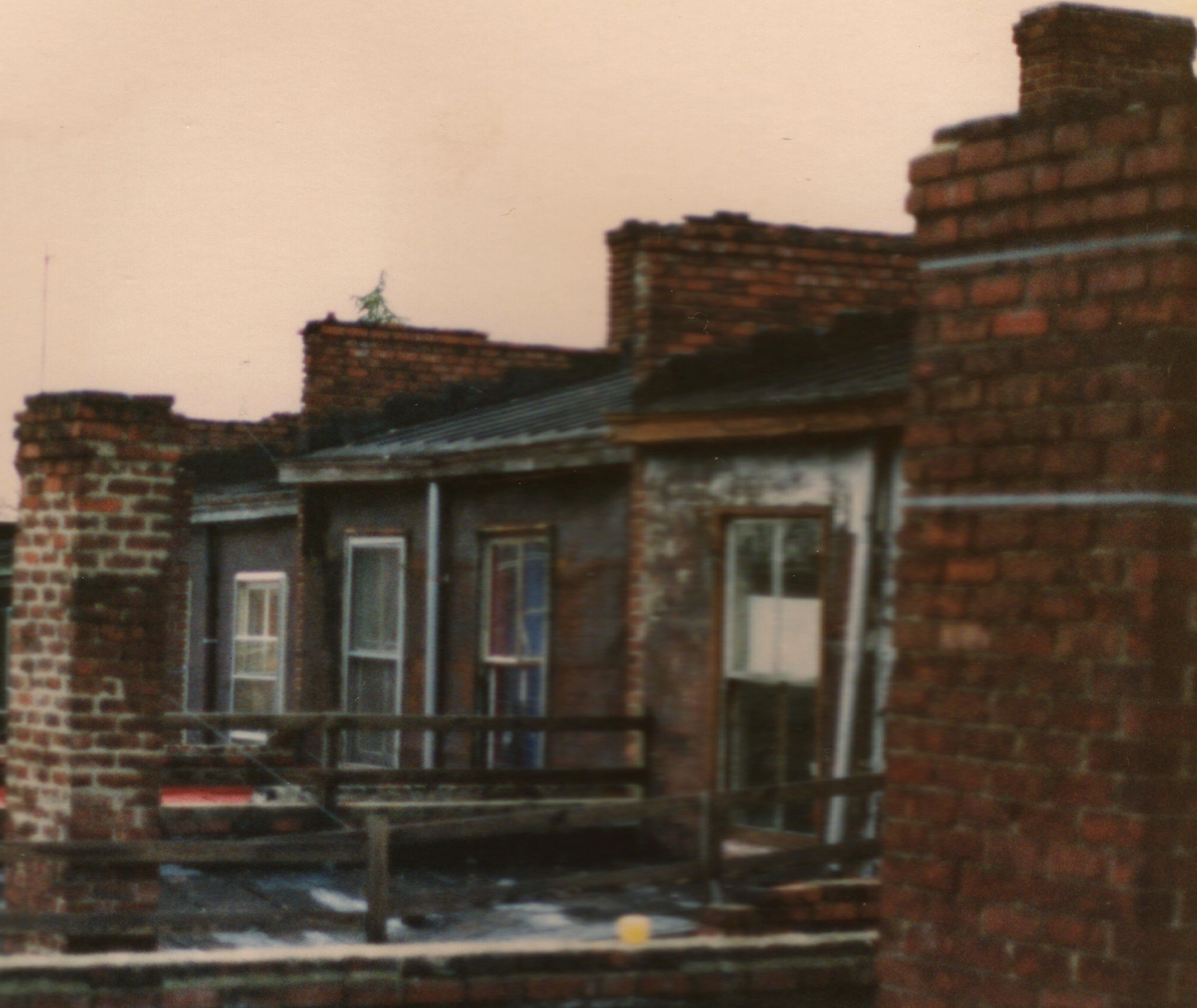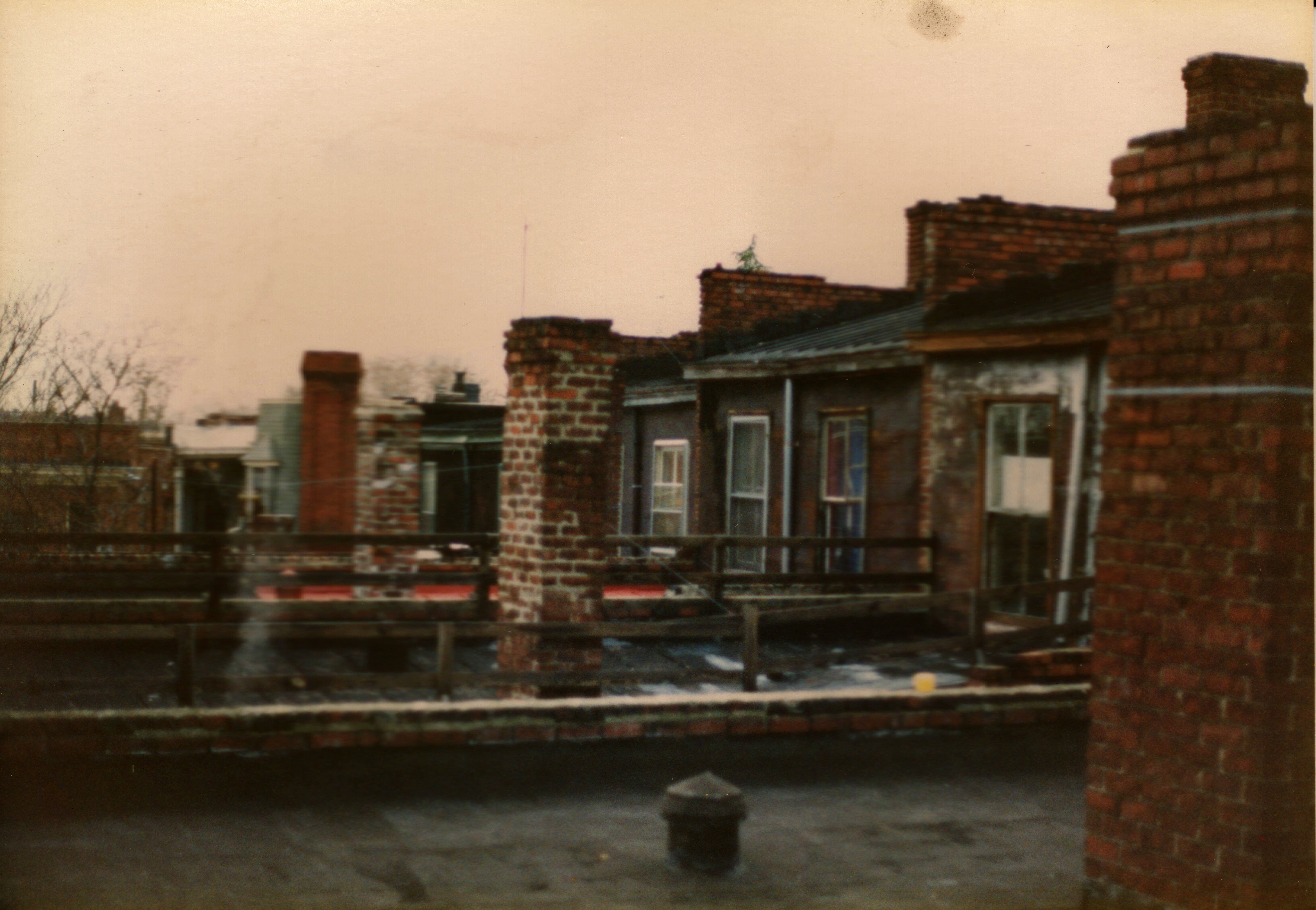 “Up on the Roof.” Old foto salvaged from the 2010 Fire taken on the back decks atop the row houses facing Grove Avenue down in the Fan, Richmond, Autumn of 1986.