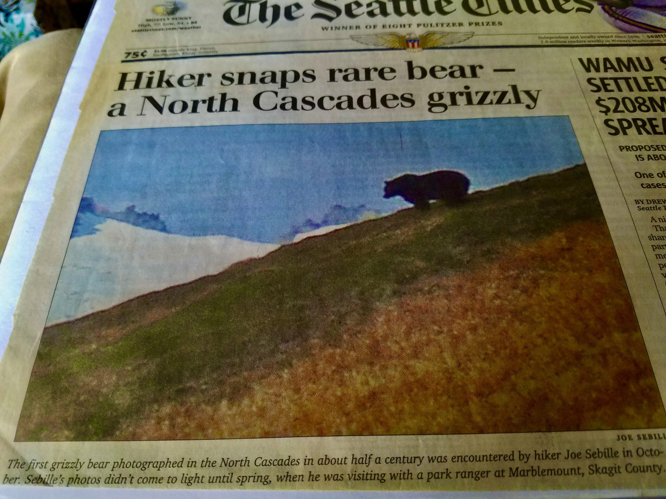 Kurt had this old newspaper from 2011 laying upon the coffee table in the den. A local outdoorsman took a foto of this bear while hiking in the national park near here. The hiker saw the bear in the western slopes of the mountains in the drainages of the Upper Cascade River not too far from the Cascade River Road. Park Rangers confirmed it was indeed a grizzly bear native to Washington and not a transient down from Canada. It was the first confirmed foto of a grizzly in Washington in nearly half-a-century. The plan is now to reintroduce more grizzlies into Washington, and it’s an issue I have mixed feelings about as it will change everything.