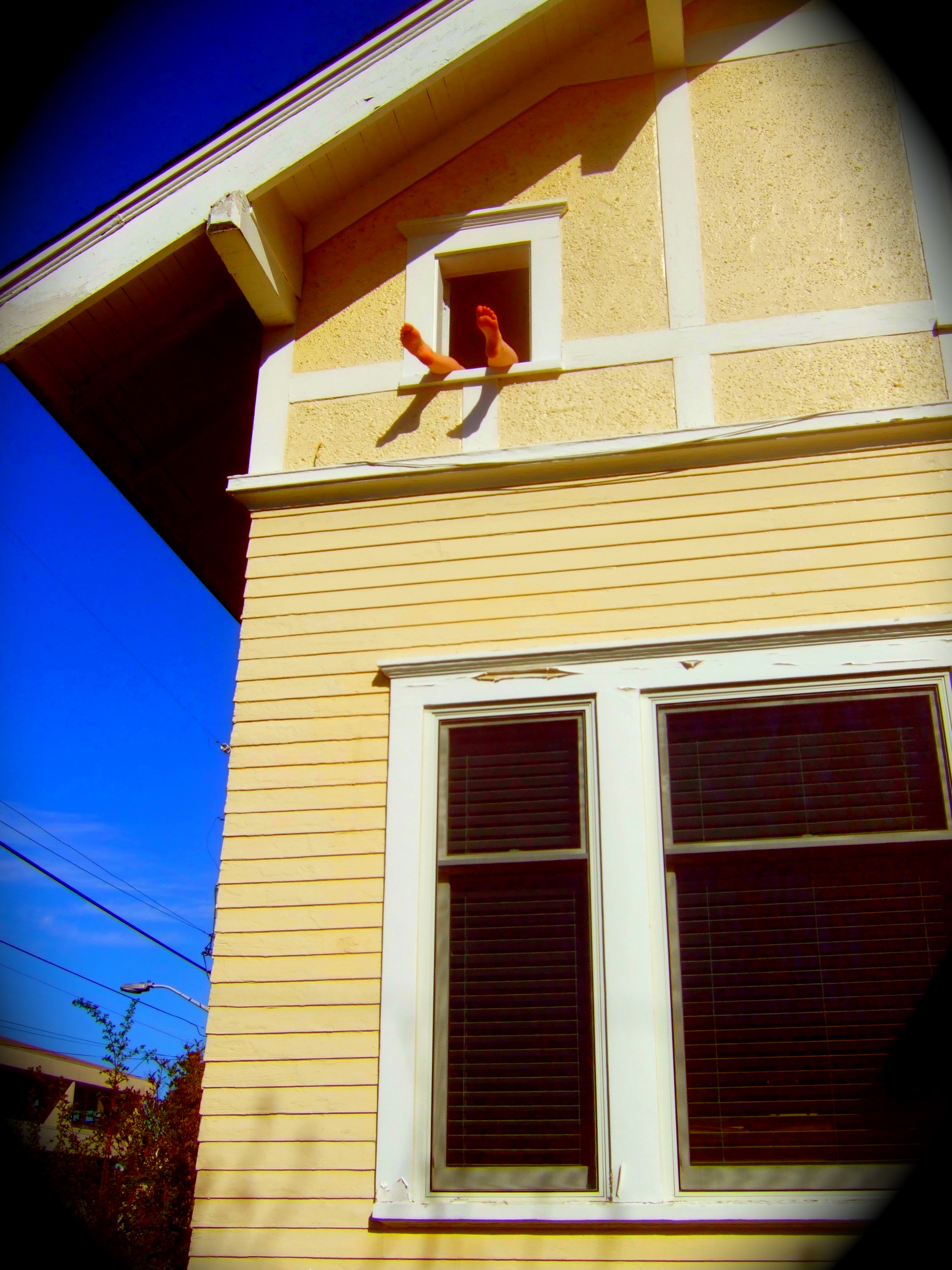Kate’s feet hanging out the window into the sunshine, Big Yellow Dragonfly House. Photo by Morgan Bass.