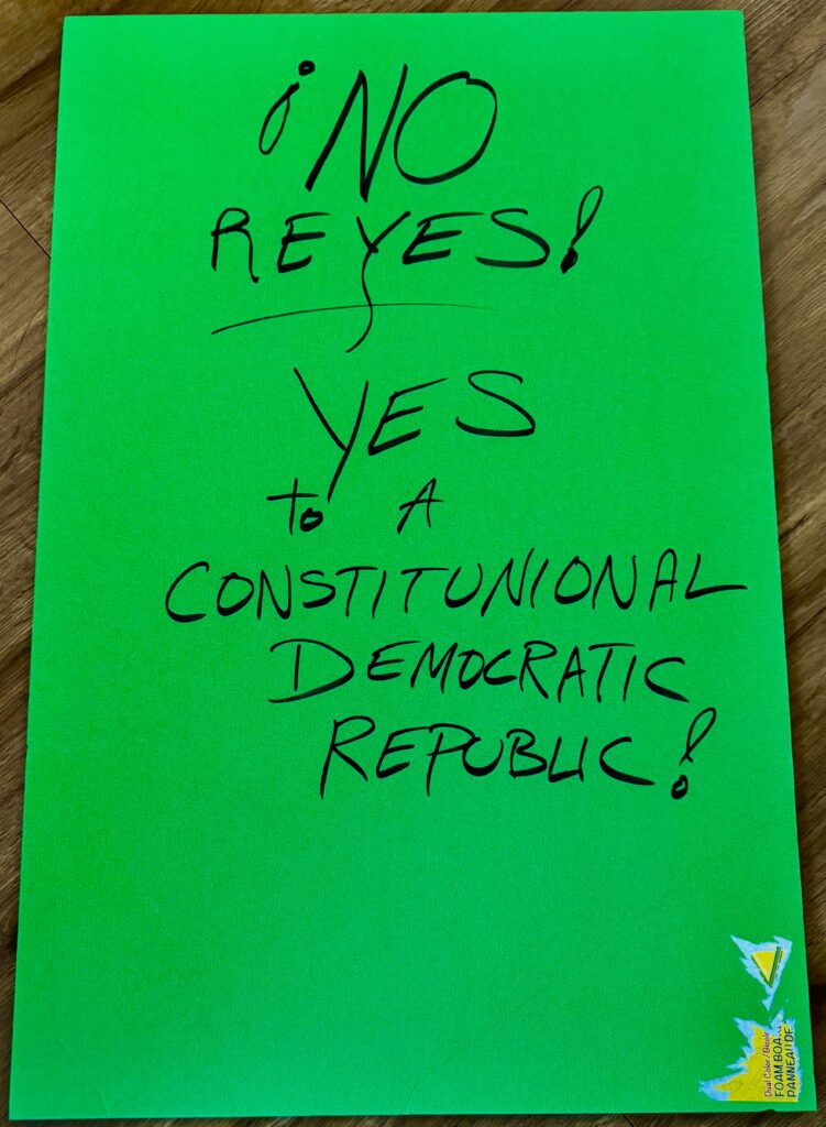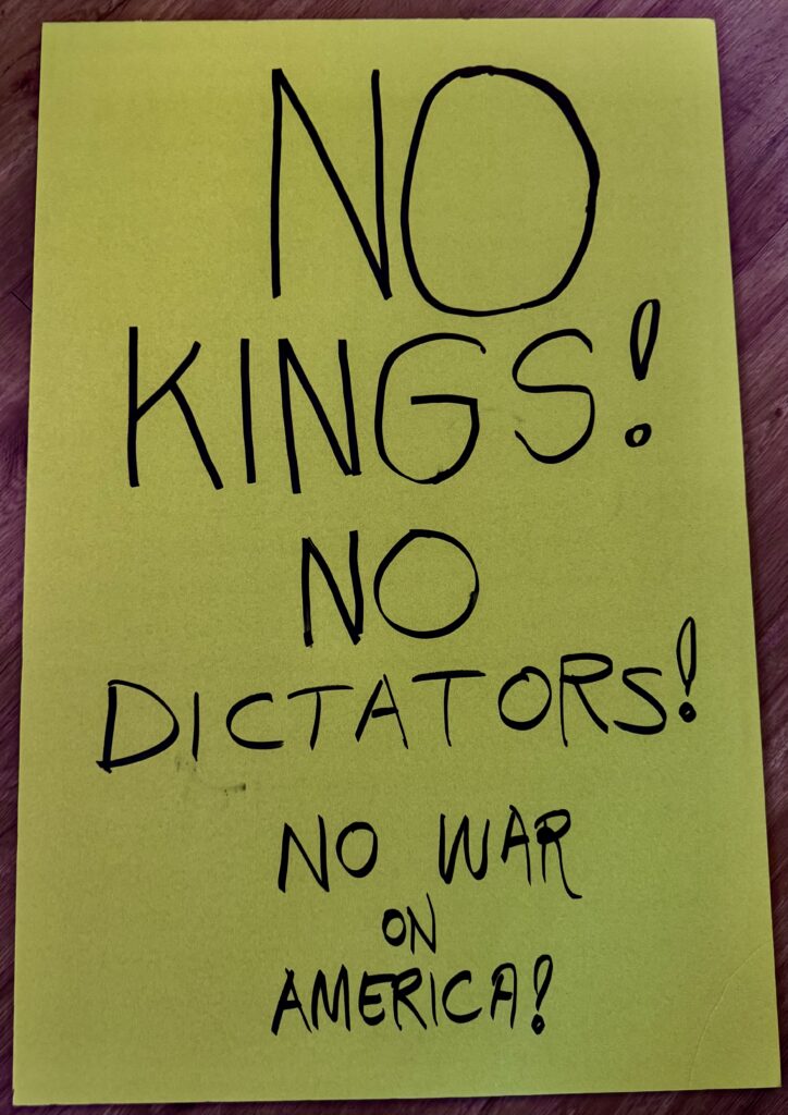 The flip side of my foam board sign. “¡NO REYES!” means “NO KINGS!” in Spanish. Wrote that to honor ALL of our immigrants, legal and illegal (the immigration system is broken and must be reformed streamlined, not brutally enforced the way it is under Trump-Vance). The second phase is a reminder what kind of government America has evolved, however messy and flawed, since we declared independence from the British and their King in 1776.