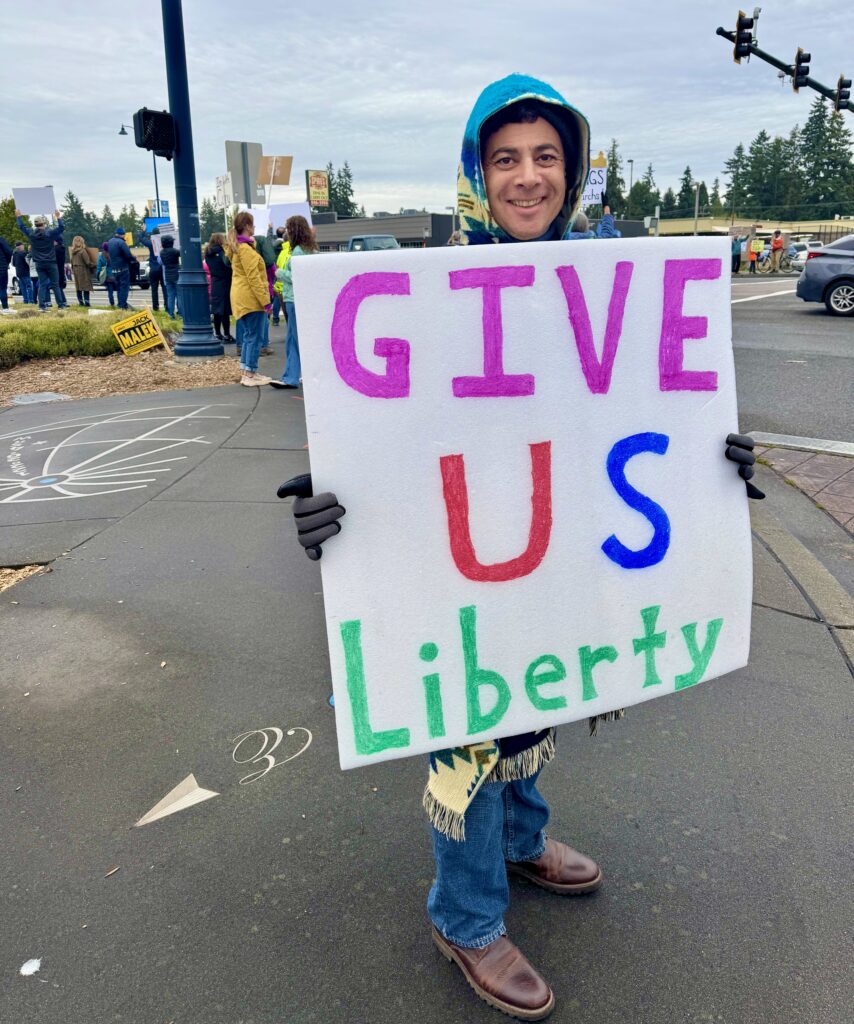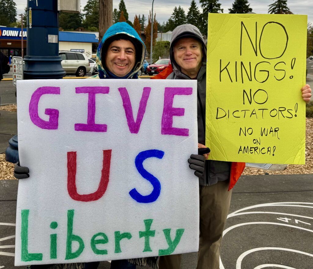Today on Saturday the 18th of October, however, Faithlyn went to Vancouver, Washington, on the North Bank of the Columbia River, to meet with a group of Deaf people including an old friend out from Virginia. I had already taken the day off work to participate in No Kings! Day, however, so I rallied with my friend Edan.  We chose to demonstrate near where both of us live in the north end of King County just above the boundary with Seattle. He actually lived in Edmonds, and my wife and I in Shoreline. Both are small satellite cities, spread out towns actually, in the beltways between Everett and Seattle, in the western portion of Washington. Edan and I have been friends for a quarter of a century. We first met in a workshop and training in Seattle back in October 2000.