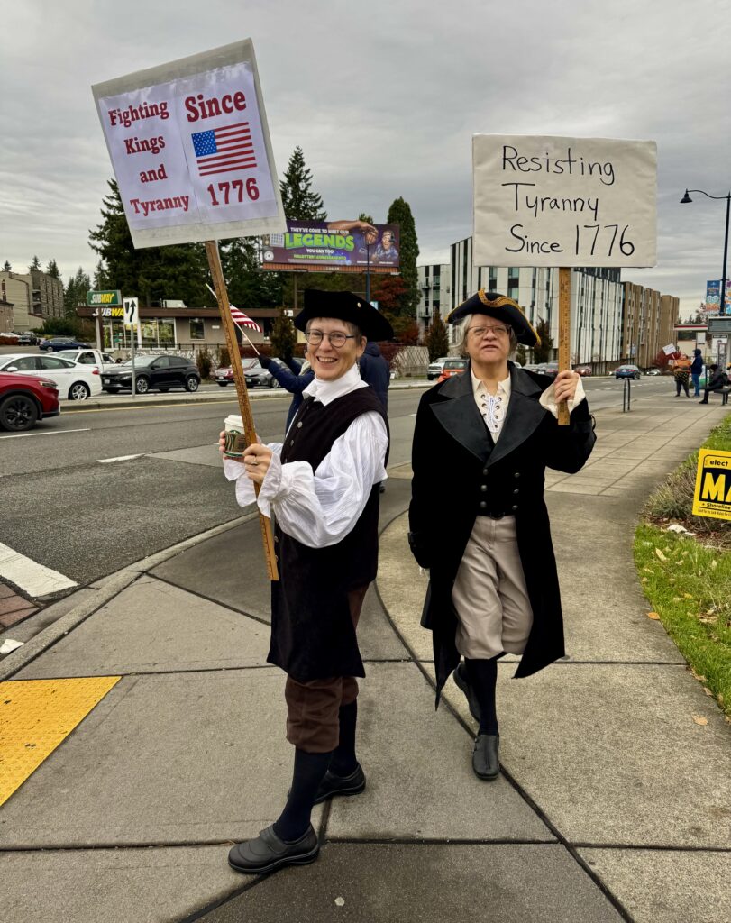 Remember it was our citizens’ army of ragged revolutionaries who, with help from the French, won our independence from the British Empire. Those were difficult times, and the British almost won. The French had their own empire, of course, and eventually their own revolution followed by another empire. The American Revolution was itself part of a global conflict of overlapping imperial wars, revolutions, and civil wars called the Second Hundred Years War. It was a world war lasting 138 years, from 1688 with the outbreak of the Nine Years’ War to 1815, the end of Napoleon’s conquests and the War of 1812, to 1826, the end of the Latin American revolutions. Here we are in 2025, practicing nonviolence as we demonstrate against a wannabe dictator in a small city in the American Pacific Northwest.