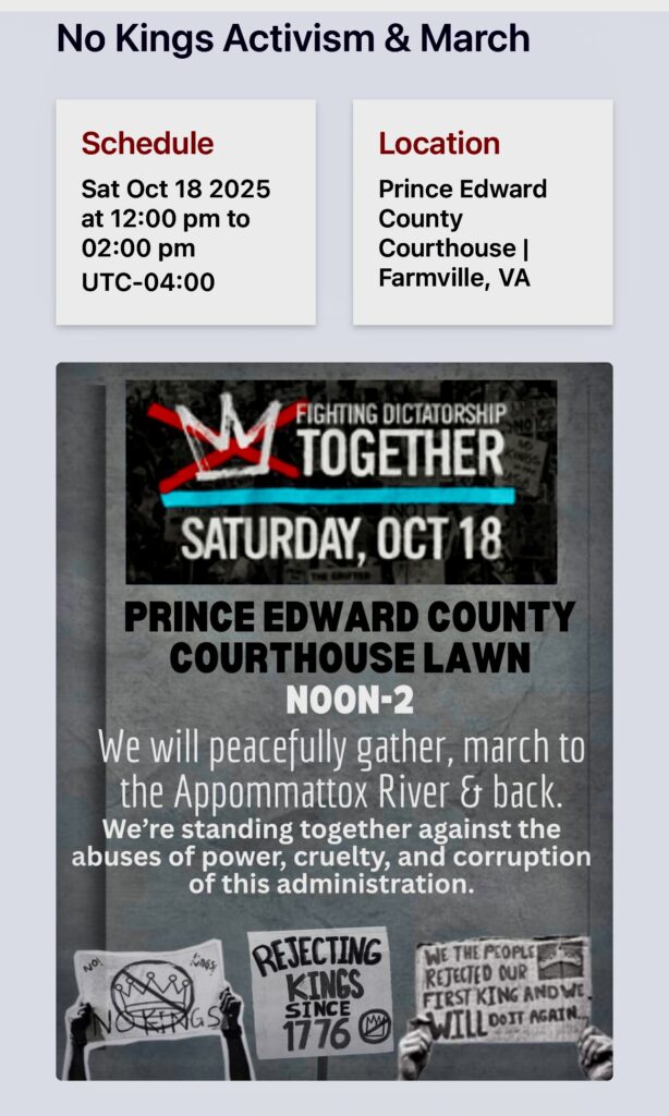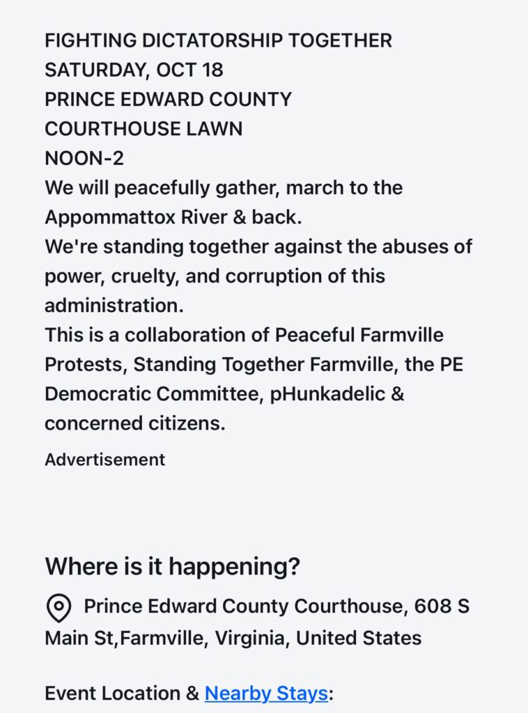 Even in Farmville, the town I was born in and then grew up on a farm outside of, had its NO KINGS! rally and march. This is from a screenshot of the rally organizers’ website.