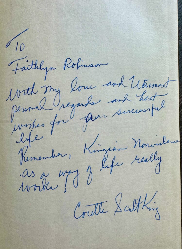 From inside of the book cover where Mrs. King signed for Faithlyn. The old book, like its late author, has been through rough times and still persevered.