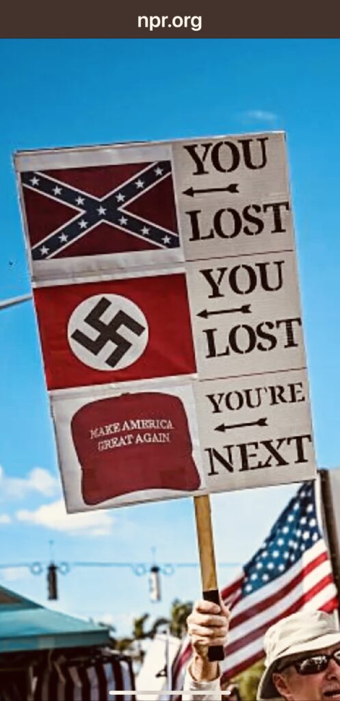 Screenshot of one’s protester’s sign from somewhere in the United States of America. This foto is from NPR & the public commons. If the sign was any taller, one could have started with the British imperial flag and “YOU LOST” alongside it. The sign’s message, however, is stark and clear with the power of threes.