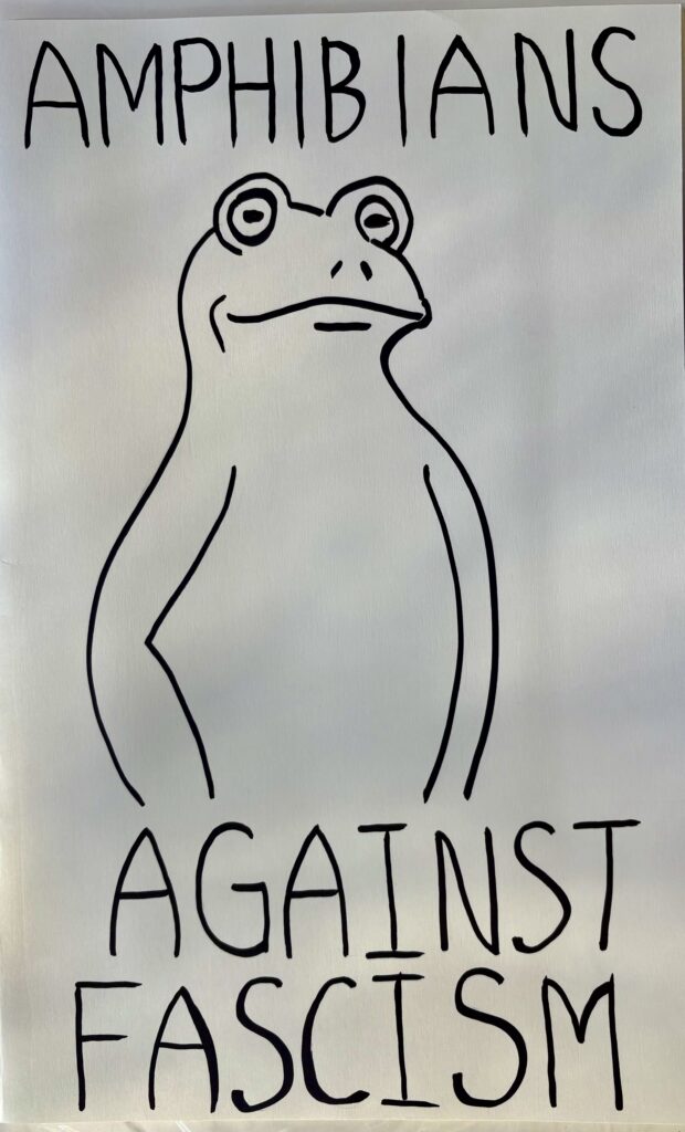 Meanwhile, across the country in Lynchburg, Virginia, my ex-wife Vie (formerly Gwen), protested against the Trump Administration with family & friends. They shared this foto of their sign. Nice, clean, clear, and direct. Twas inspired by Seth Todd, the inflatable green froggie guy dancing peacefully against ICE violence against his Mexican Latino community in Portland, Oregon. Todd had an ICE agent pepper sprayed thru the rear air vents of his frog costume on a Thursday night back on 2 October. A video of the incident went viral, and a meme was born. Historically, green frogs and toads have been symbols of revolt by both Right and Left wing groups. This time it’s a potent symbol of nonviolent civil disobedience and radical comedy highlighting the ridiculousness and cruelty of Trump’s despotism.