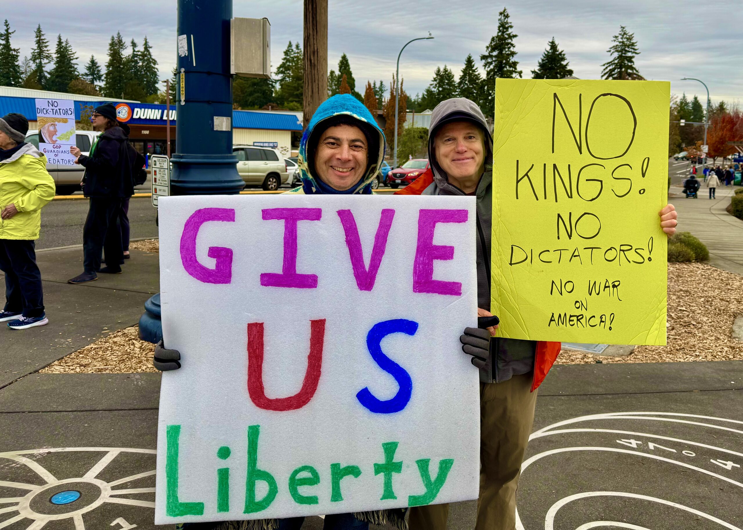Two longtime friends protesting at the corner of N. 185th Street and Aurora Avenue/99 N. on the edge of Shoreline’s Town Center and Sculpture Park on the Interurban Trail. Edan’s on the left, paraphrasing from Patrick Henry’s famous 1775 speech in Virginia. On the picture right is me, the author. A happy stranger took our foto with my iPhone. Instead of saying, “Cheese!” or “Smile!,” she said, “OK, say, ‘Fuck Trump!'”