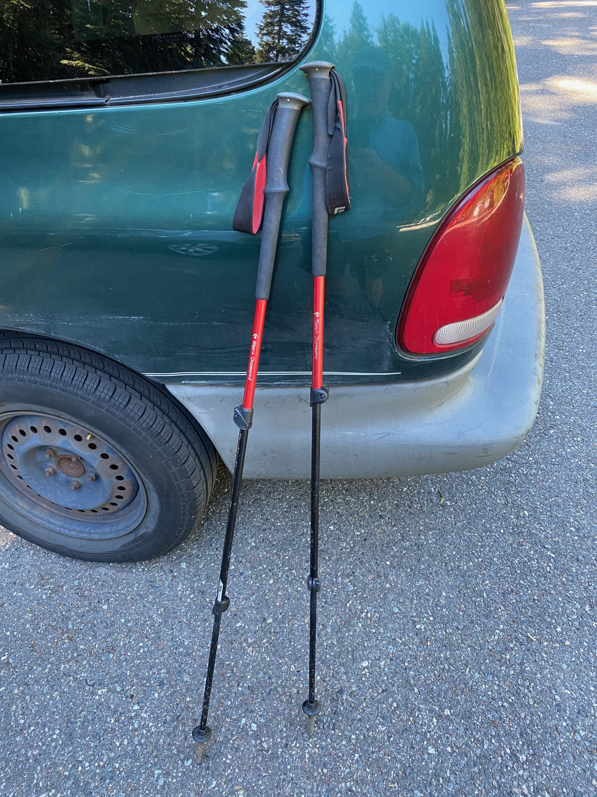 Trekking poles! Sometimes I use one, switching back n’ forth, sometimes none, & sometimes both. Black Diamond Trail Trekkers fer Man Peoples; 490 grams.