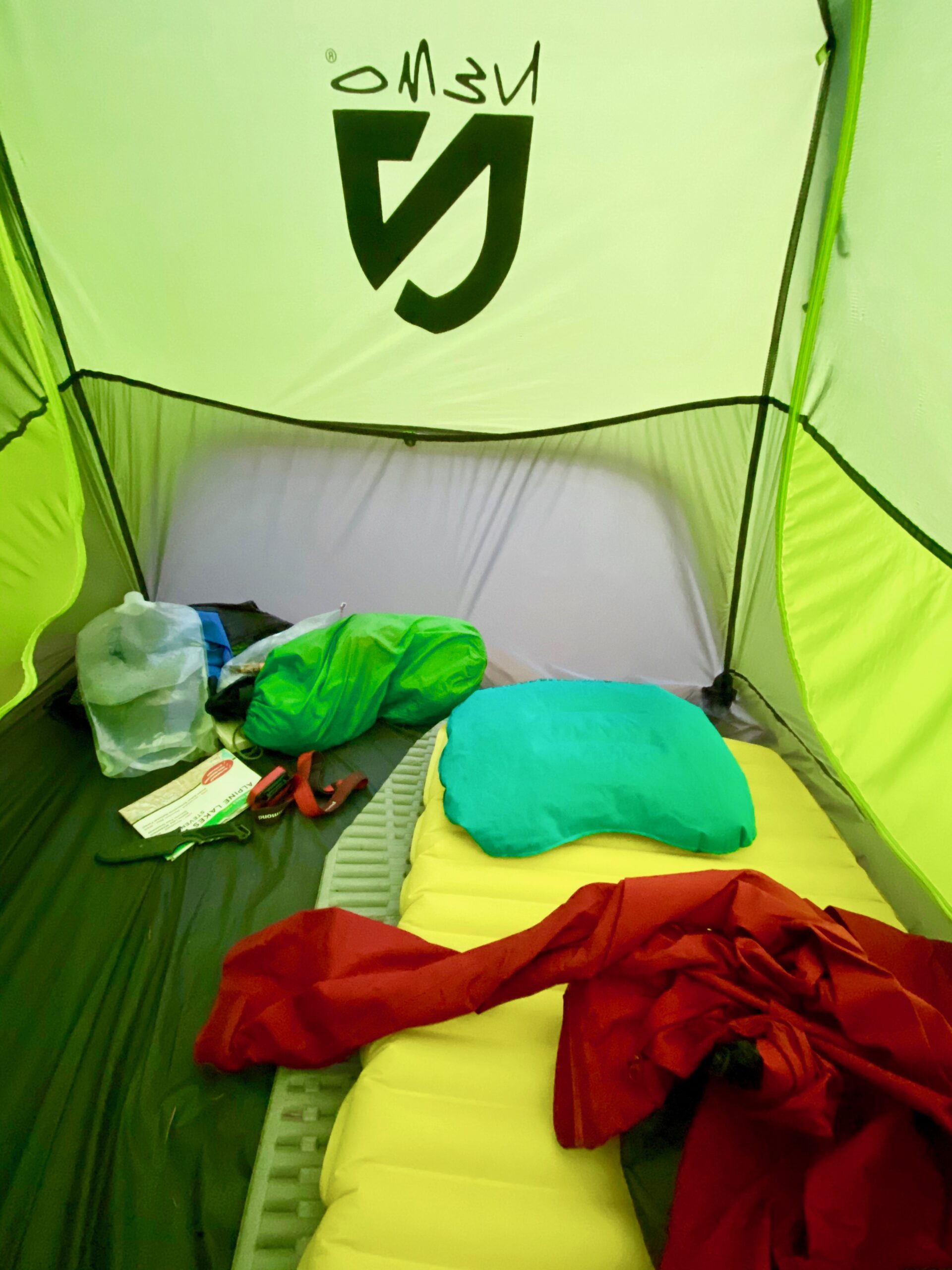Awake inside my tent at 7:30 in the morning. My tent is a Nemo Hornet 2P liteweight backpacking tent from 2016. Nemo’s a fantastic little outdoor adventure company out of Nashua, New Hampshire.