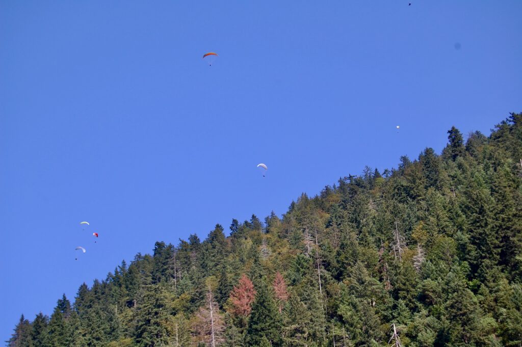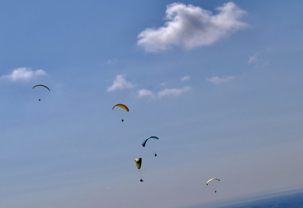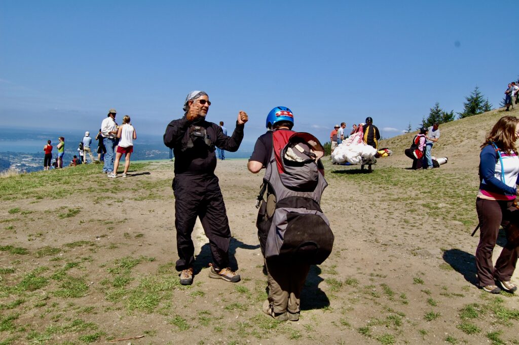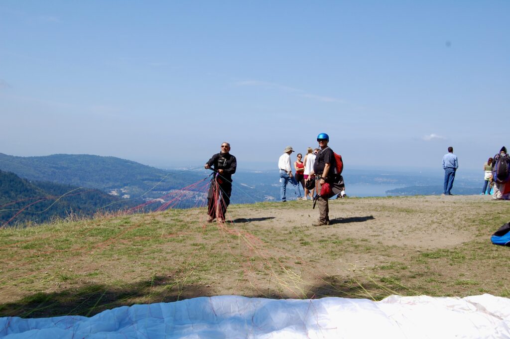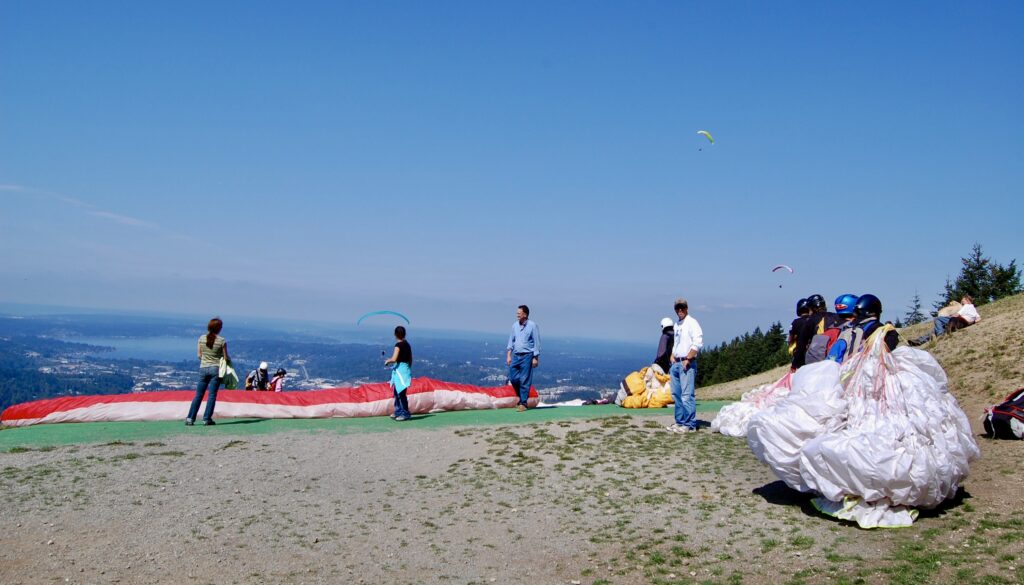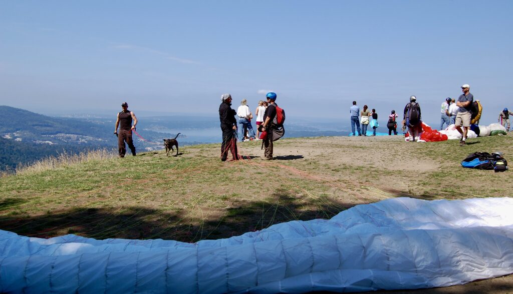 Are they up there yet? I know it takes time to hike back up the mountain to the launchpad, set everything up including carefully untangling the lines & spreading out the canopy wing and getting properly buckled in, final checks, waiting for a turn, then running off the cliff to leap into the air.