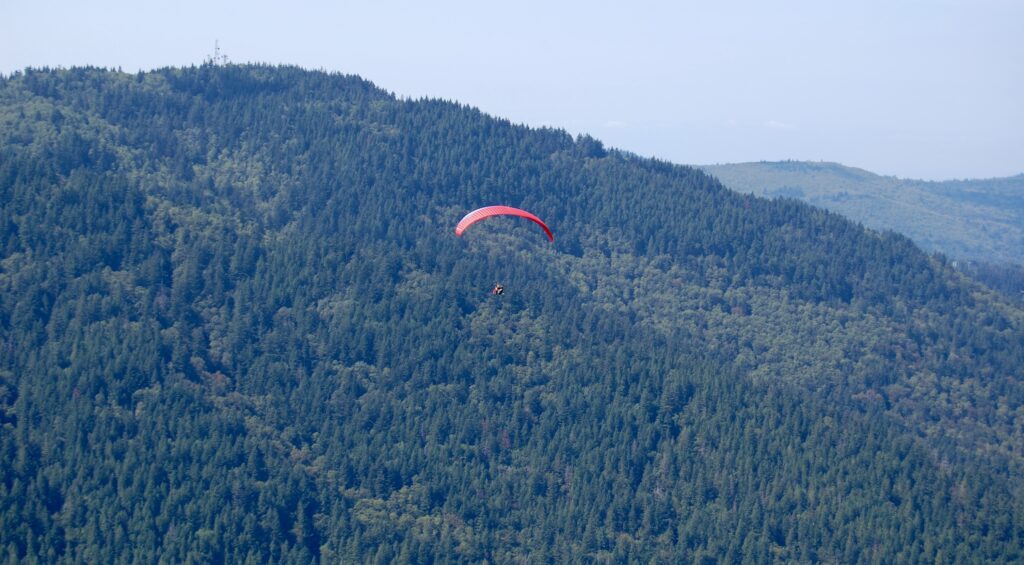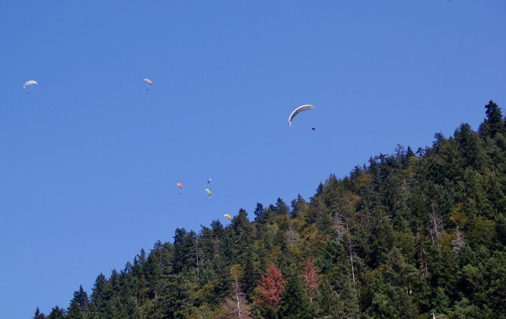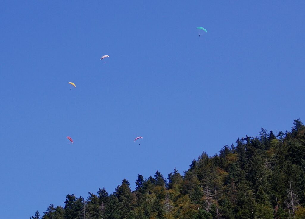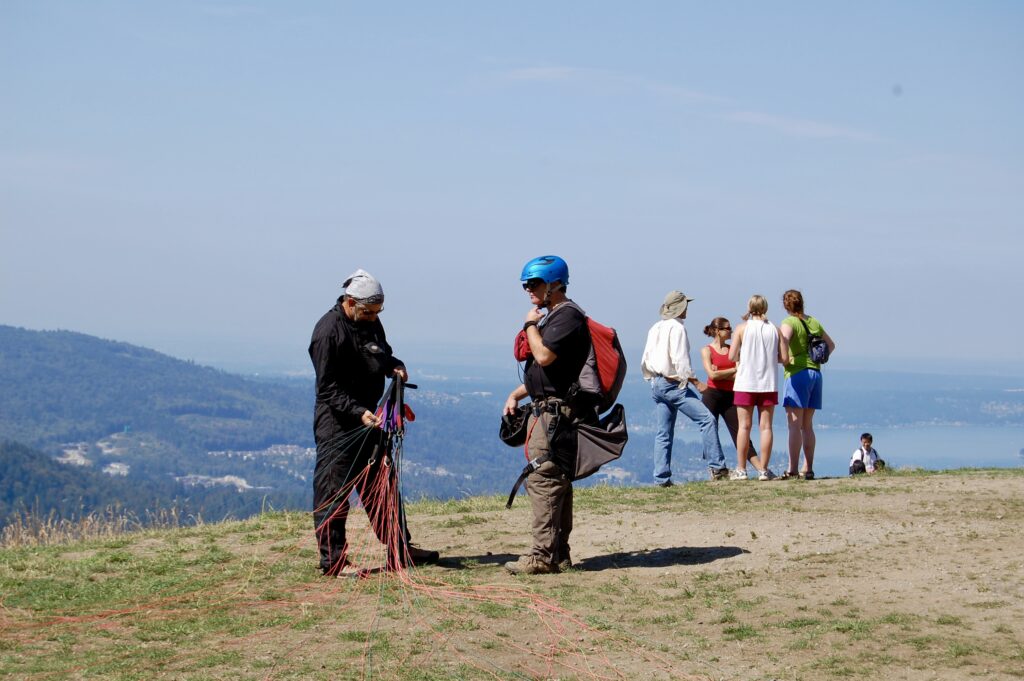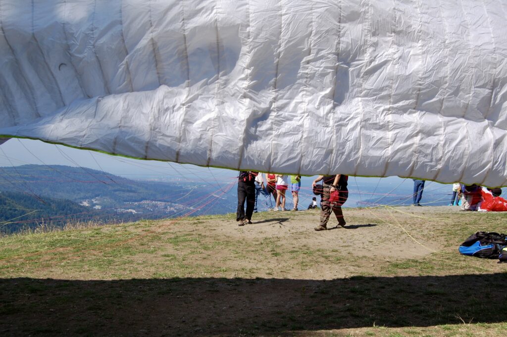 Are they up there yet? I know it takes time to hike back up the mountain to the launchpad, set everything up including carefully untangling the lines & spreading out the canopy wing and getting properly buckled in, final checks, waiting for a turn, then running off the cliff to leap into the air.