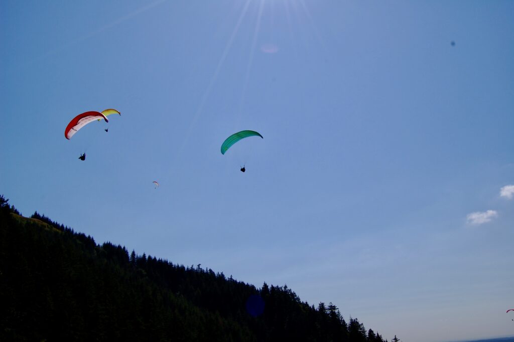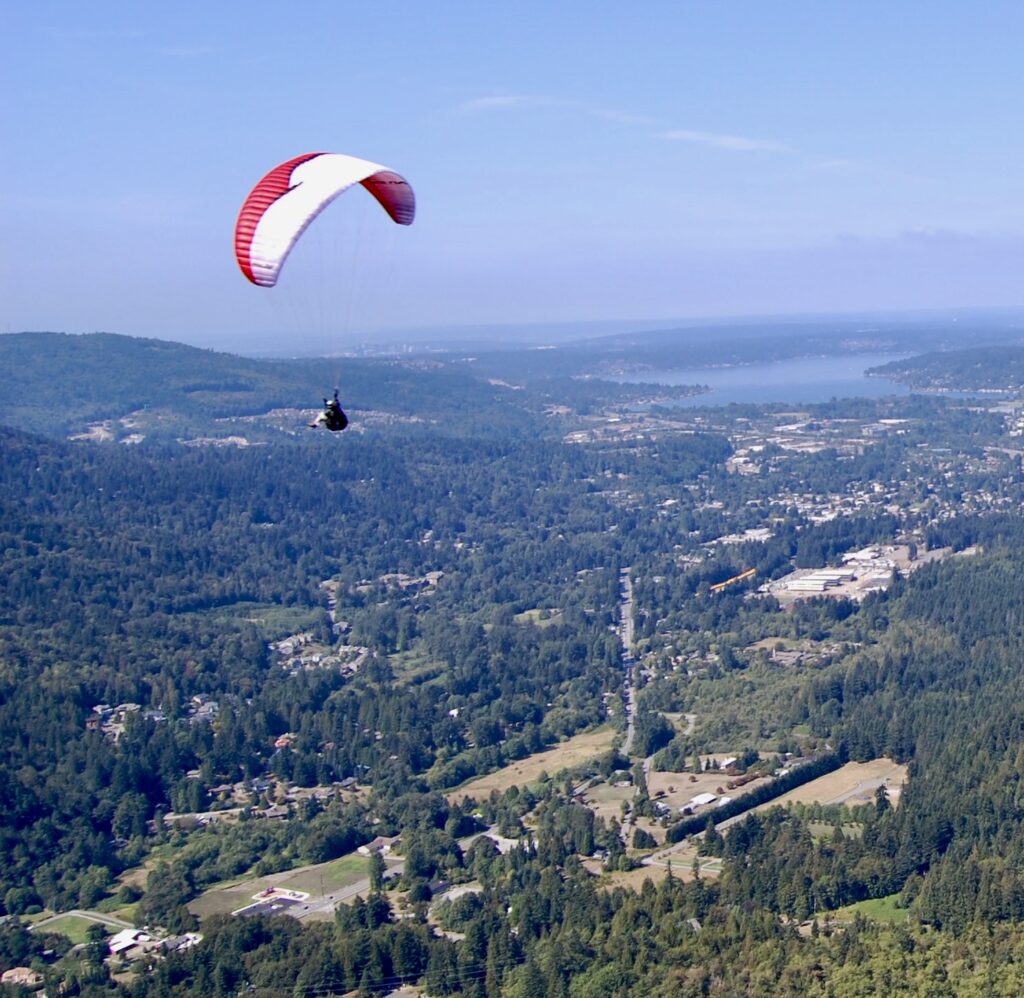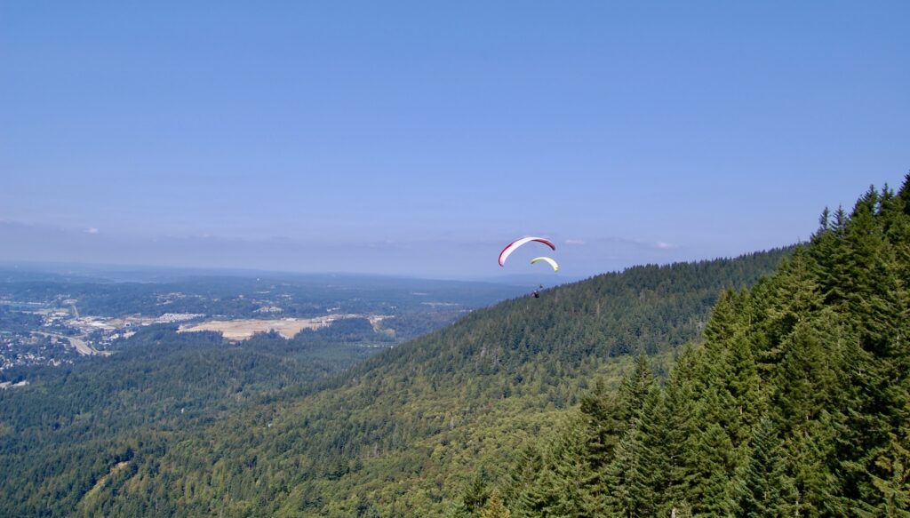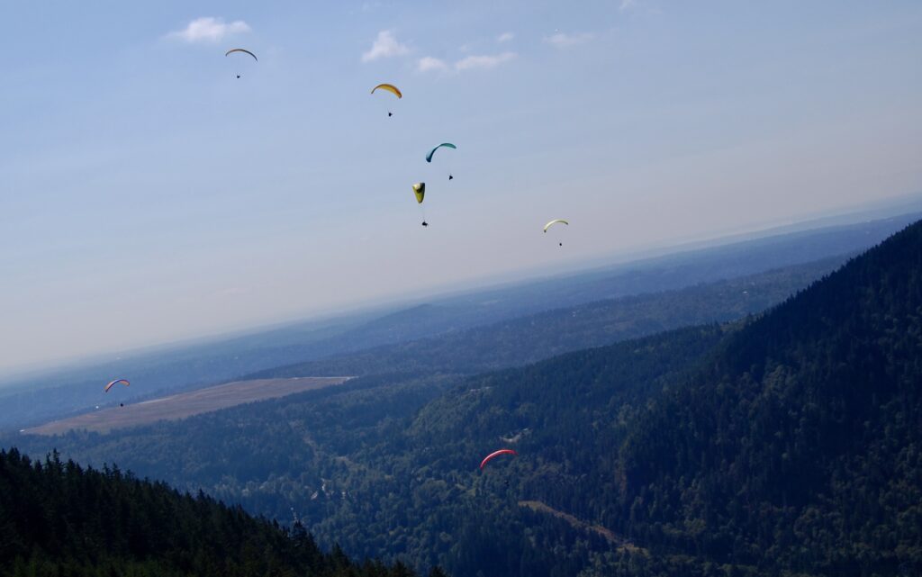 And we’re in the air! Zooming around Tiger Mountain & over the valleys below and alongside other paragliders, too.