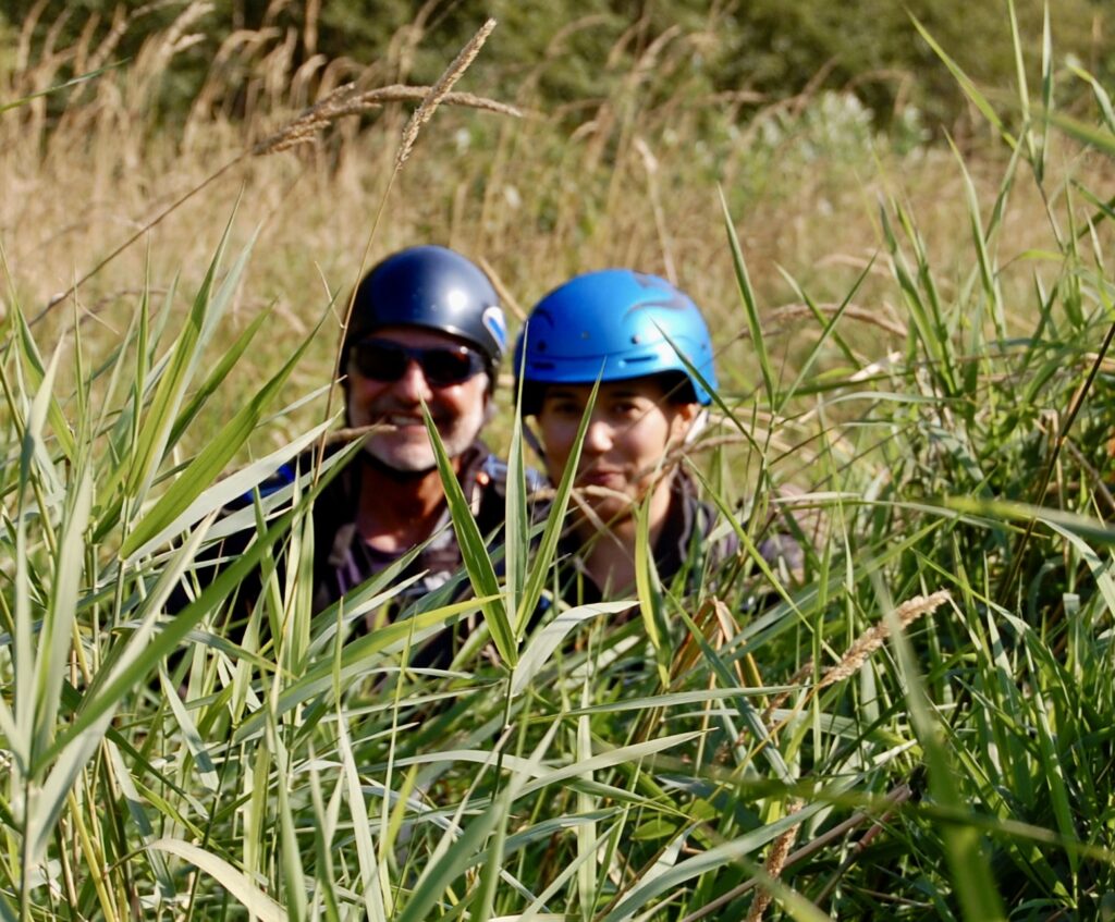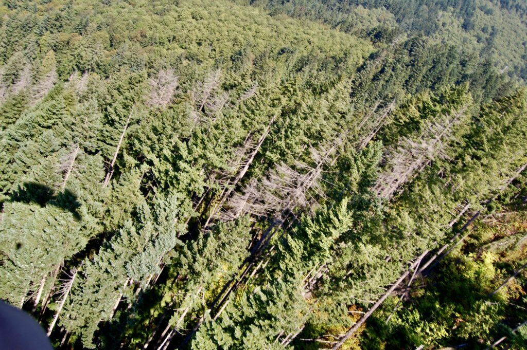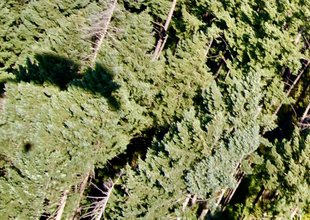 Catching thermals and other currents in the air invisible to untrained eyes as we soar over the forest canopy. See the bug-shaped shadow on the treetops in the lower left corner of the foto? With the crescent-shaped shadow above? That’s us up in the air, woo HOO!