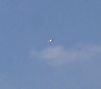 This is definitely not a rocket, meteor, comet, birds, clouds, and is clearly metallic and reflective. Is it a small airplane? Then where are the wings? A helicopter? Is the angle of tilt obscuring the rotors? But the rotors on even a small chopper would be visible, yes? Balloons? Pretty big for balloons, and that doesn’t make any sense here. Another faraway paraglider waaay up in the air? Hmn…don’t know. One thing I notice under a powerful magnifying lens is the air around the object appears shimmery, warped, like a field is disturbing whatever it is. My imagination goes to a UAP, Unidentified Anomalous Phenomena, operated by NHIs or a Non-Human Intelligence. Many people report discovering objects in fotos long after the fact and upon enlargement and cropping. I’ve encountered UFOs and other paranormal things and have studied those subjects for years, ever since a whole-family experience with a massive metal sphere back in the mid-late 1960s. Whatever it is may well have a mundane explanation, and for now I really don’t have any idea. What do any of you see here?