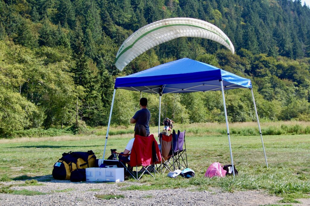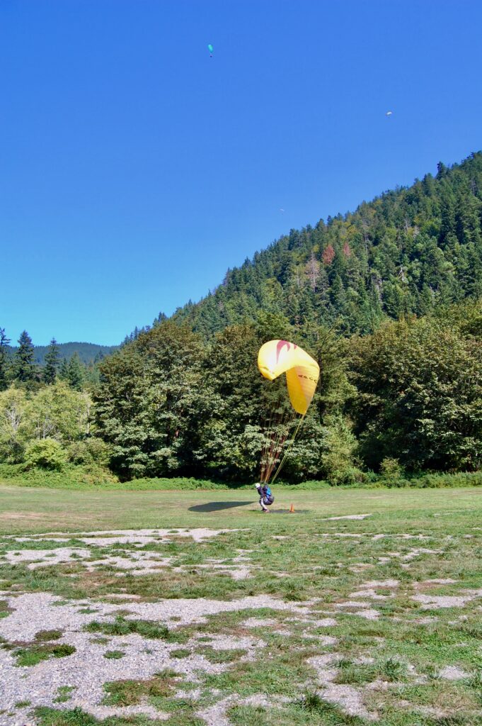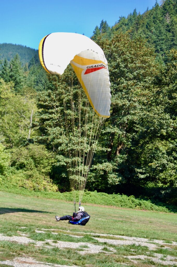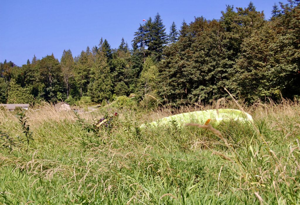 We land in the tall grass at the outer edge of the Landing Zone Field next to another paraglider. This field is also the trailhead of the Chirico Trail.