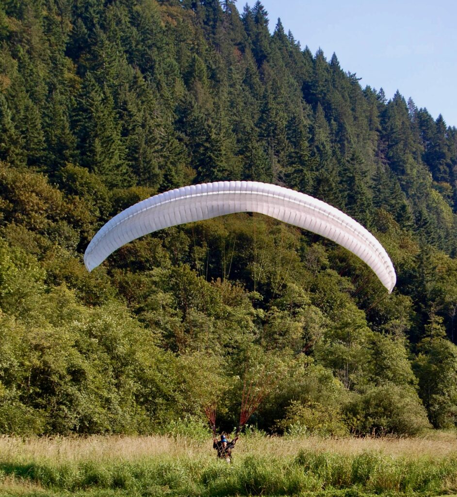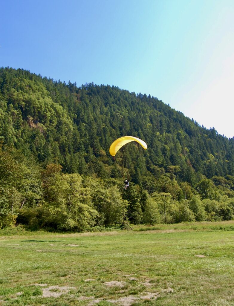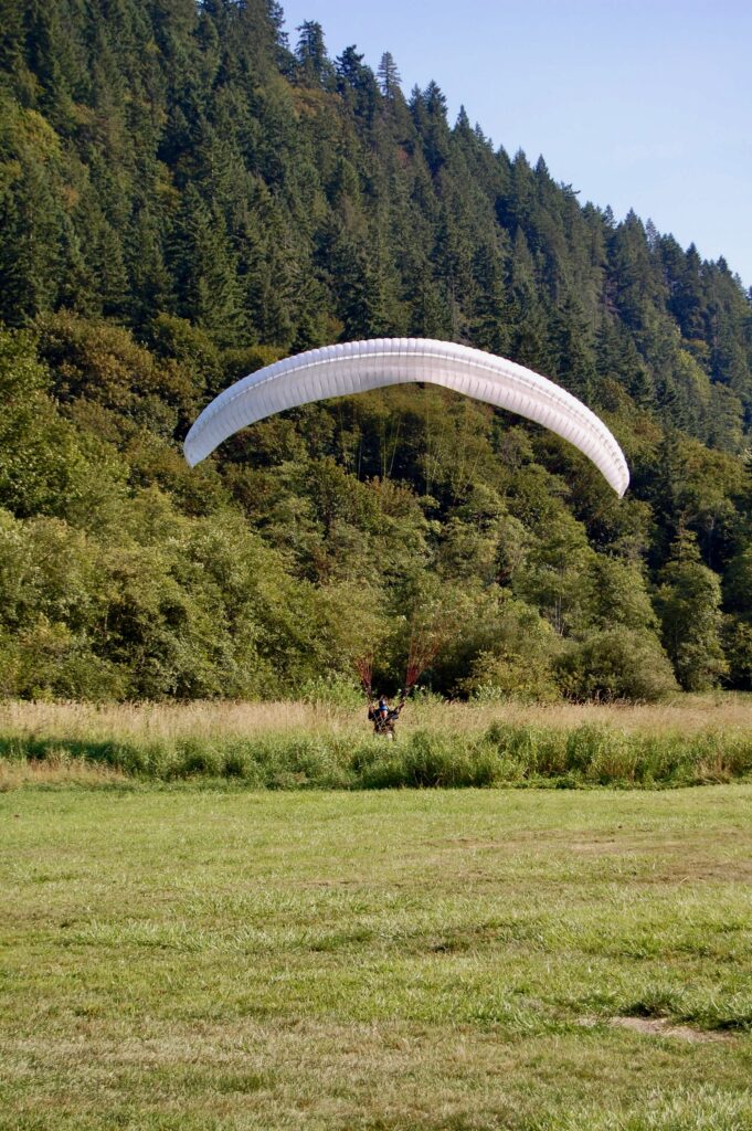 Staring up at our wing against the sky. Kristina awaits her turn back on the side of Tiger Mountain, so John asks me to choose between a rapid, spiral descent called a spiral dive or the Devil’s Spiral, or a slower, looping, swinging back’n’forth descent. Being an adrenalin junkie, I shout, “Devil’s spiral!” John laughed and we spun rapidly down like a tornado to land with a bump in the grassy field below. Had to grip tightly with both hands, so no pictures, y’all. Aye, the Devils’s Spiral Dive, woo HOO!