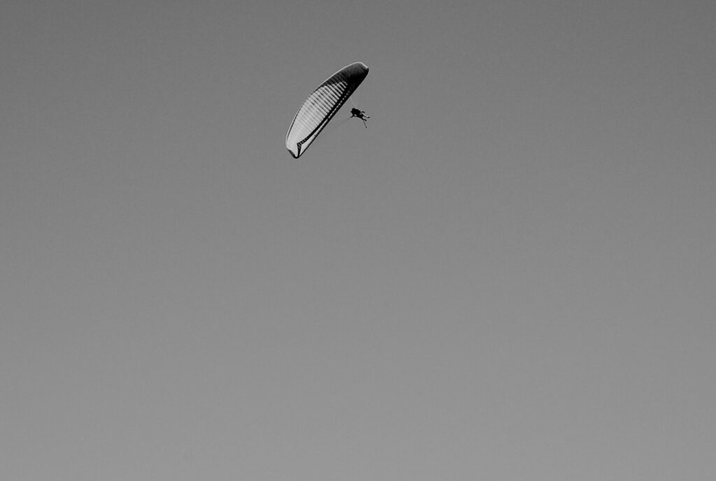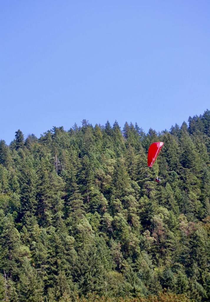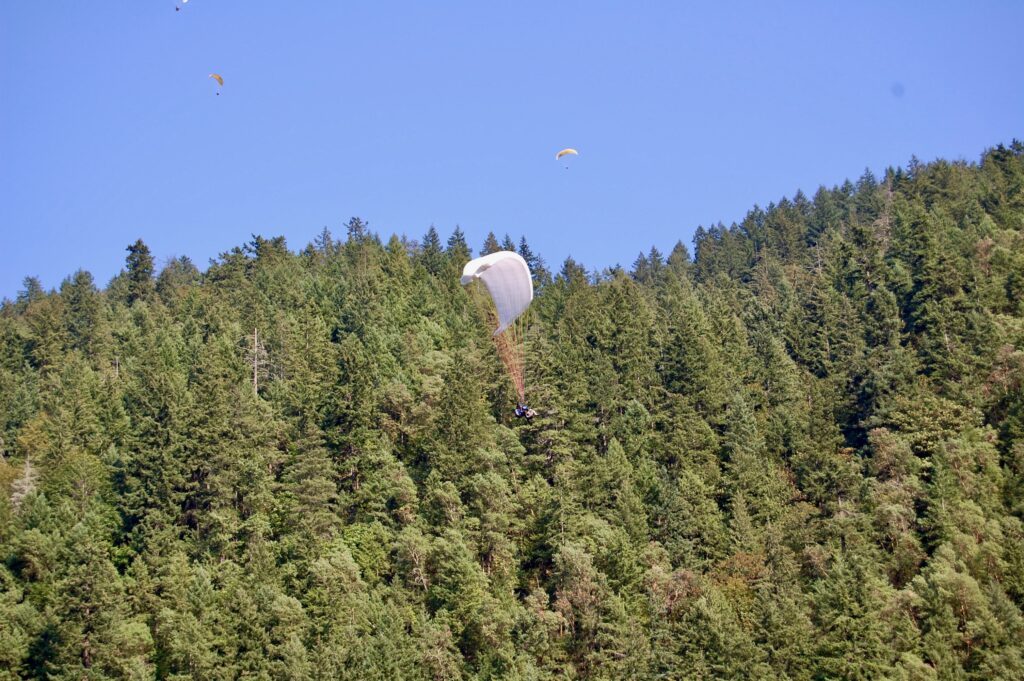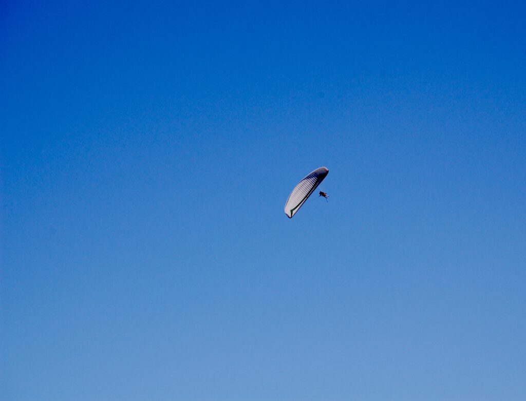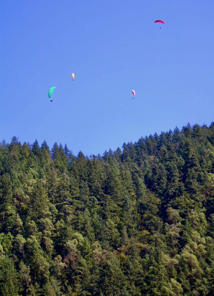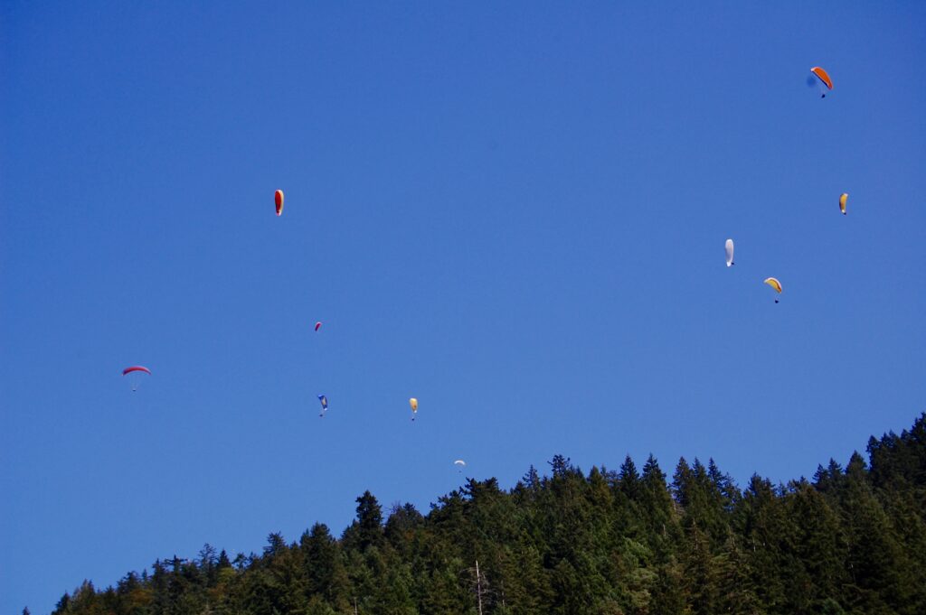 Rockin’ the wind! From the ground paragliders and their wings may look almost still, but, my goodness, we’re moving quite fast upon invisible currents of air coiling and rising between the hills and mountains here on either side of the valley.