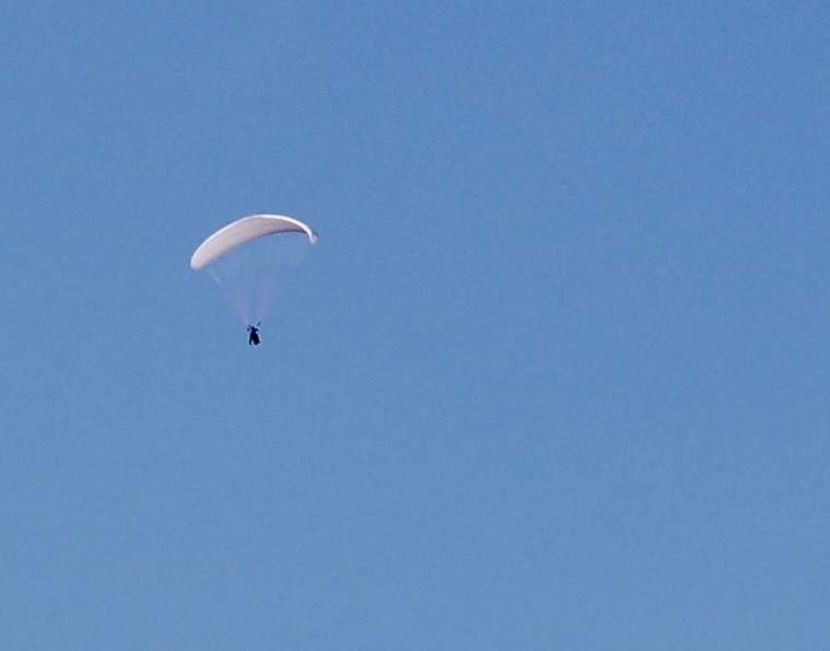 Wonder if the paraglider up in the far, far upper left corner is John & Kristina. John’s wing is all white without stripes, but it’s hard to discern one or tandem from my position on the edge of the landing zone.