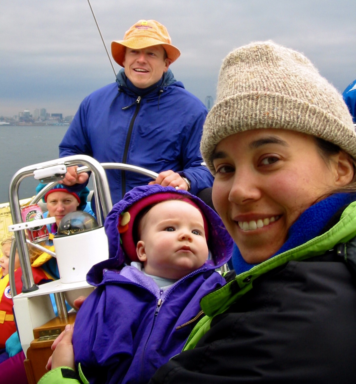 Baby Talia in her 7th month with her mom Kristina. Kate’s mostly out of sight in this foto, but, my goodness, Gwen there is squinting rather sternly. William (me) shoots pictures from the bow looking back as we head out into Puget Sound and the Greater Salish Sea.