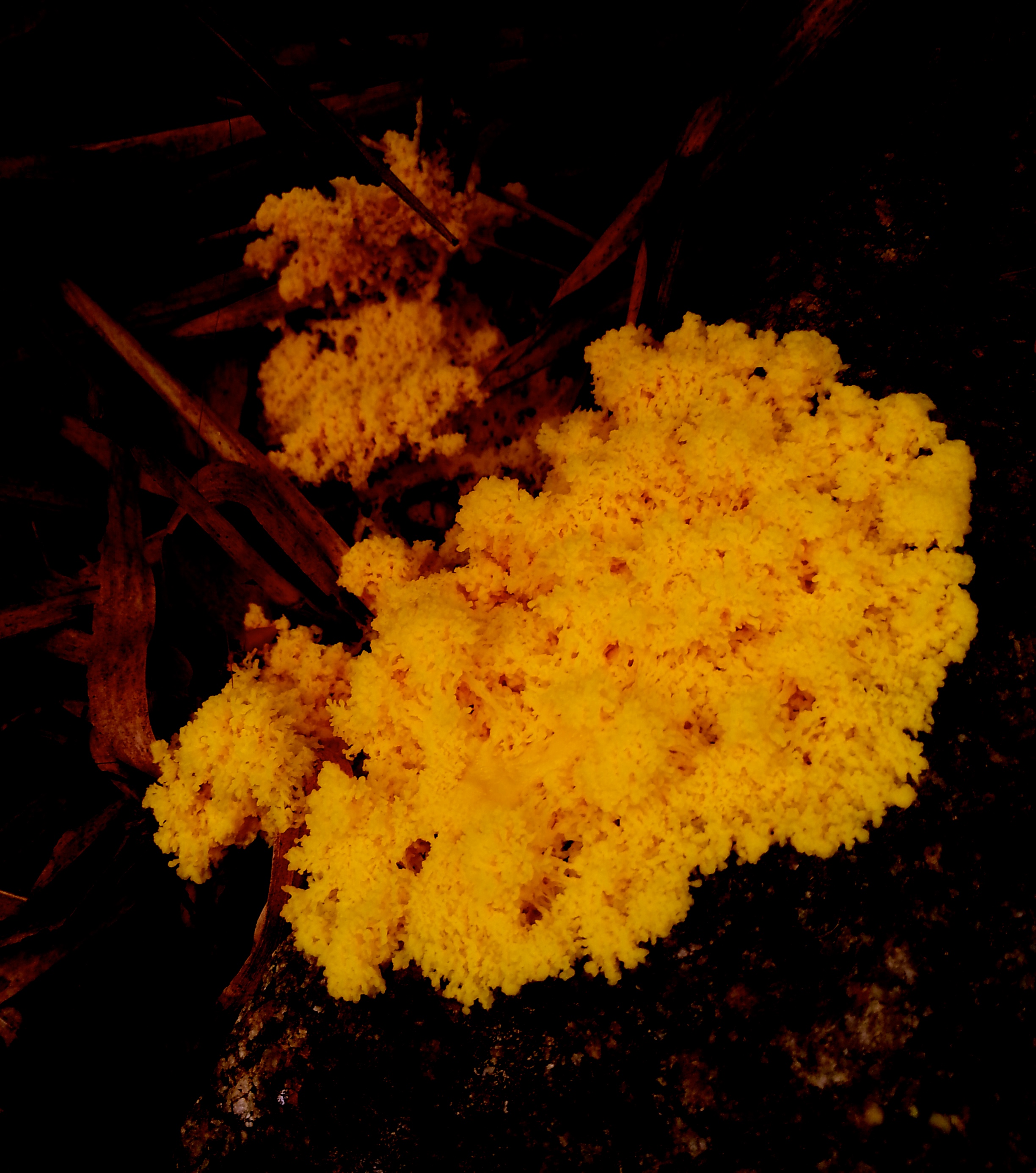 At least twice back when I was a young boy I kept a slime mold for a pet. Intuitively I gave them mixed-gender names such as Henry Ann. They thrived inside my Daddy’s used cardboard cigar boxes upon a diet of mulch mixed from barnyard sawdust, old leaves, and grass clippings. Eventually they would dry up, form weird little tentacles with eyeball-like sacs at their tips, and seemingly die. Found out they were morphing from large moving protoplasmic multi-nuclei cells into spore stalks.