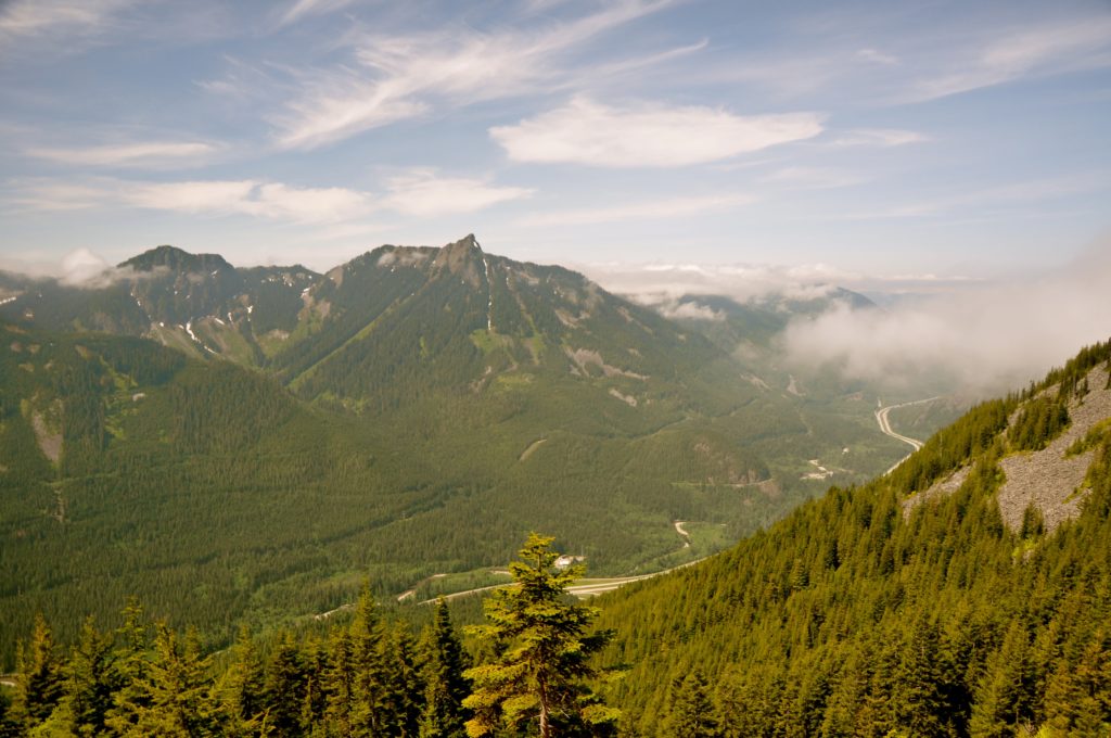 McClellan Butte in the distance across the Valley of the North Fork Snoqualmie River. I-90 heads east towards Bellevue & Seattle, west back up into the Pass.