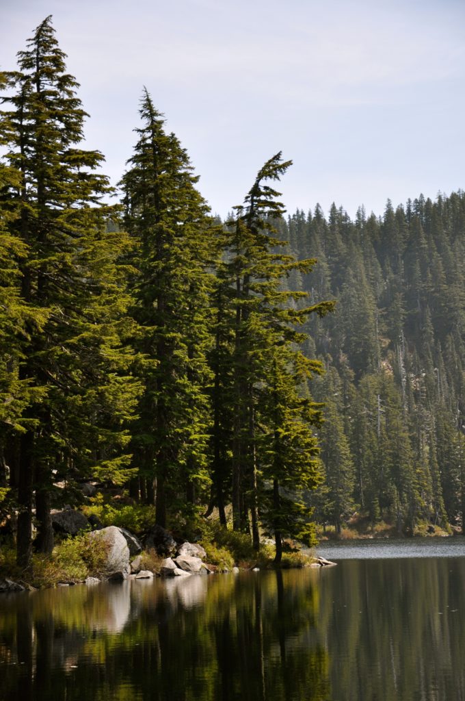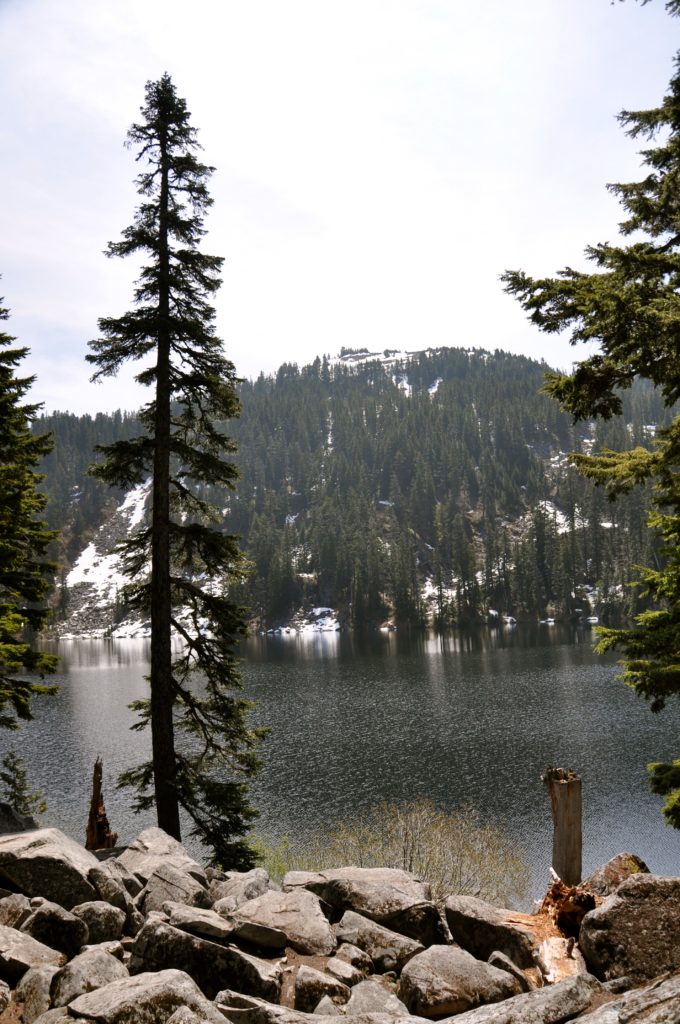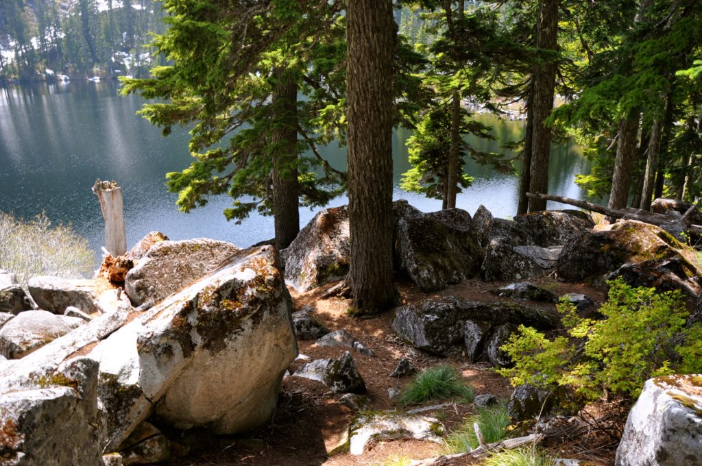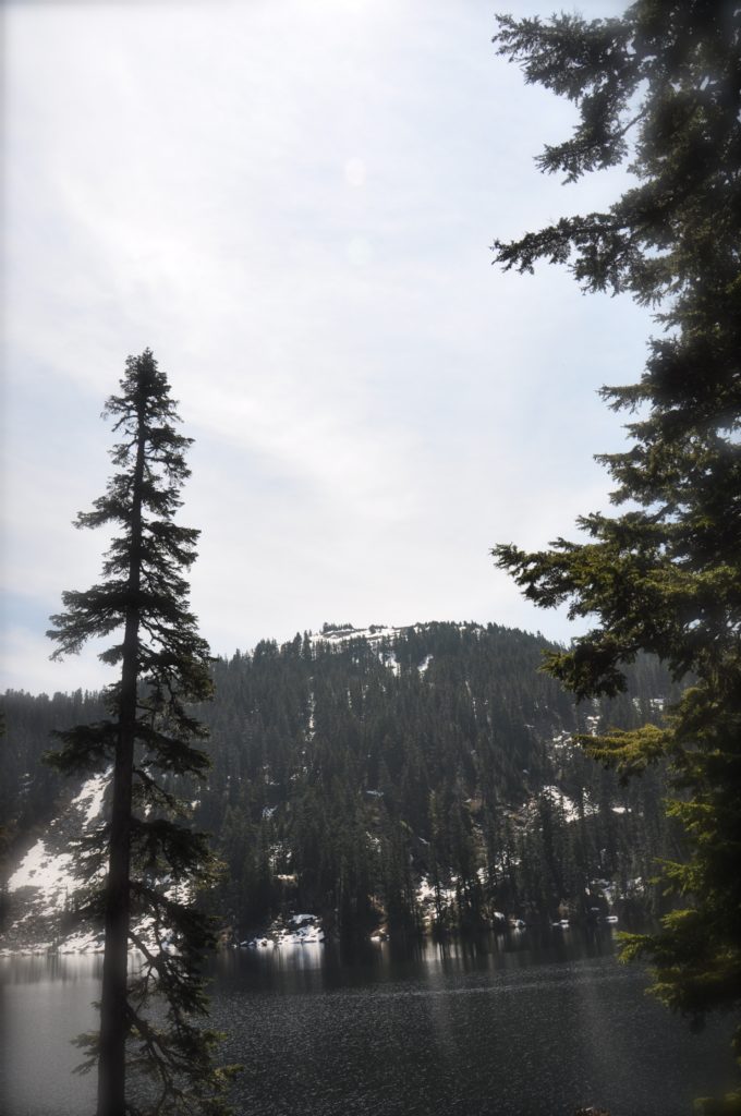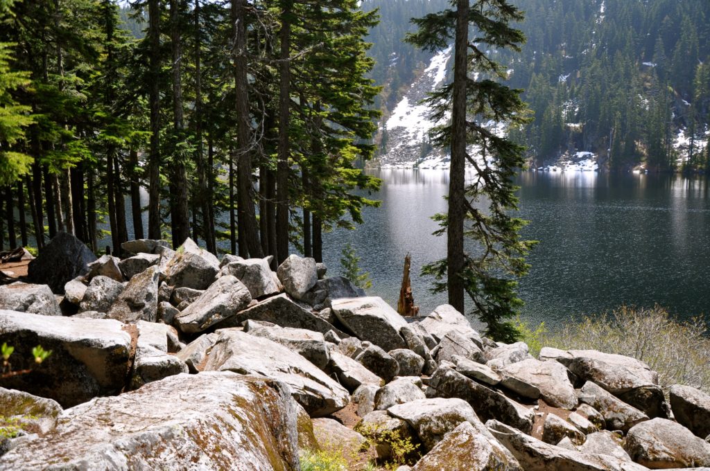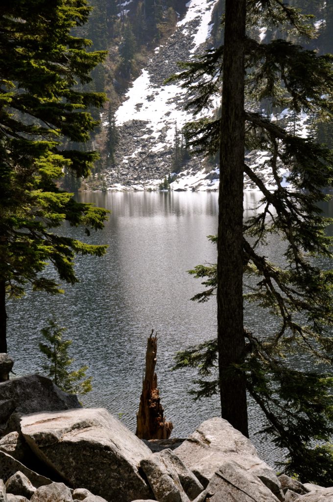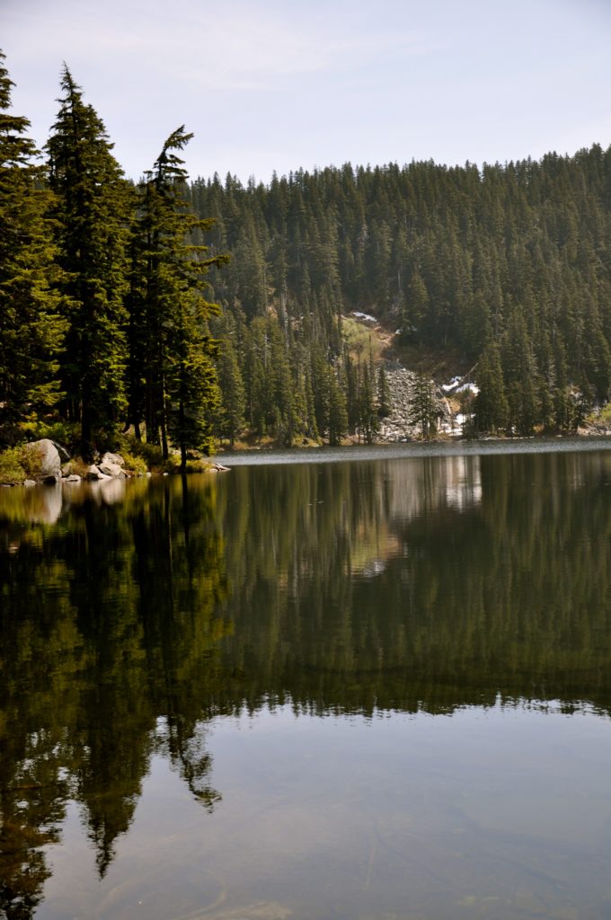 Mason Lake captivates even in the bright harshness of early afternoon sun. We had crested a 4,320 ft. high open rocky ridge a short time before dropping down the northern flanks back into forest before reaching the lake. Mason Lake sits in a bowl at about 4200 ft.