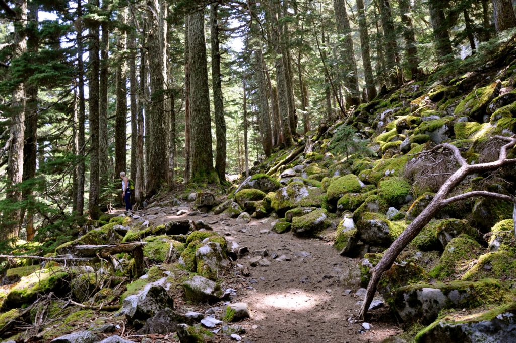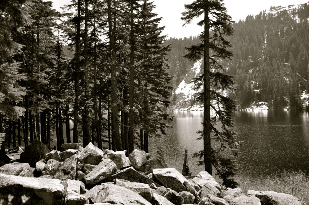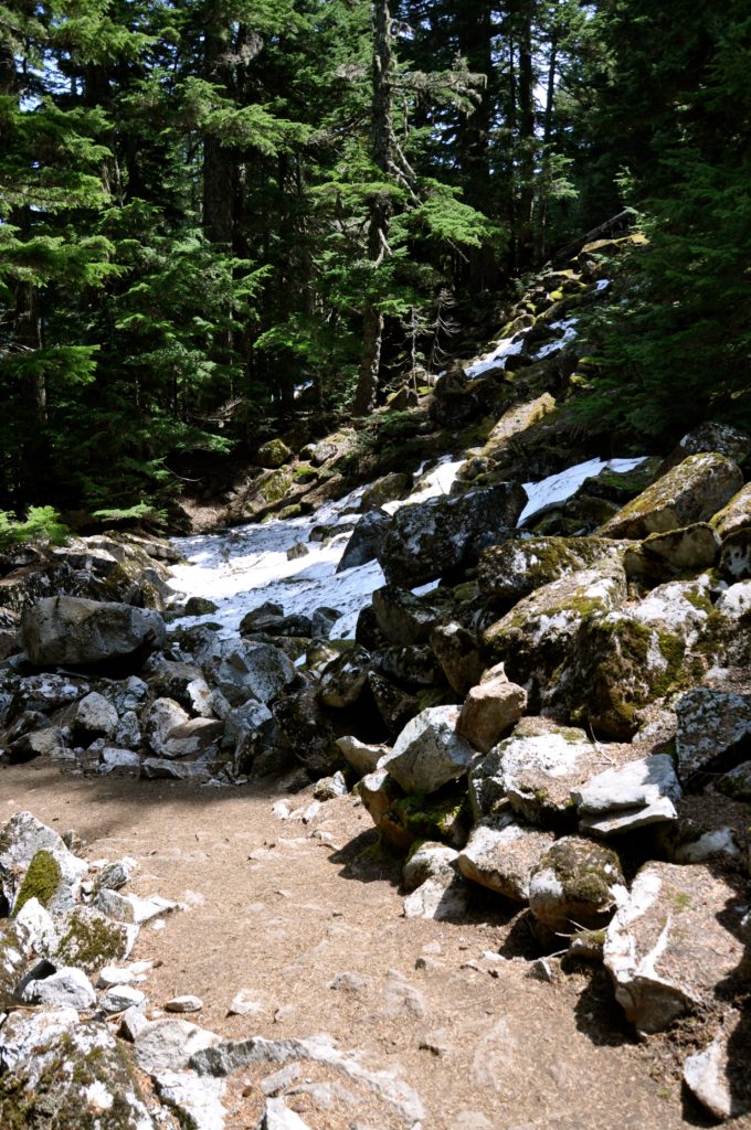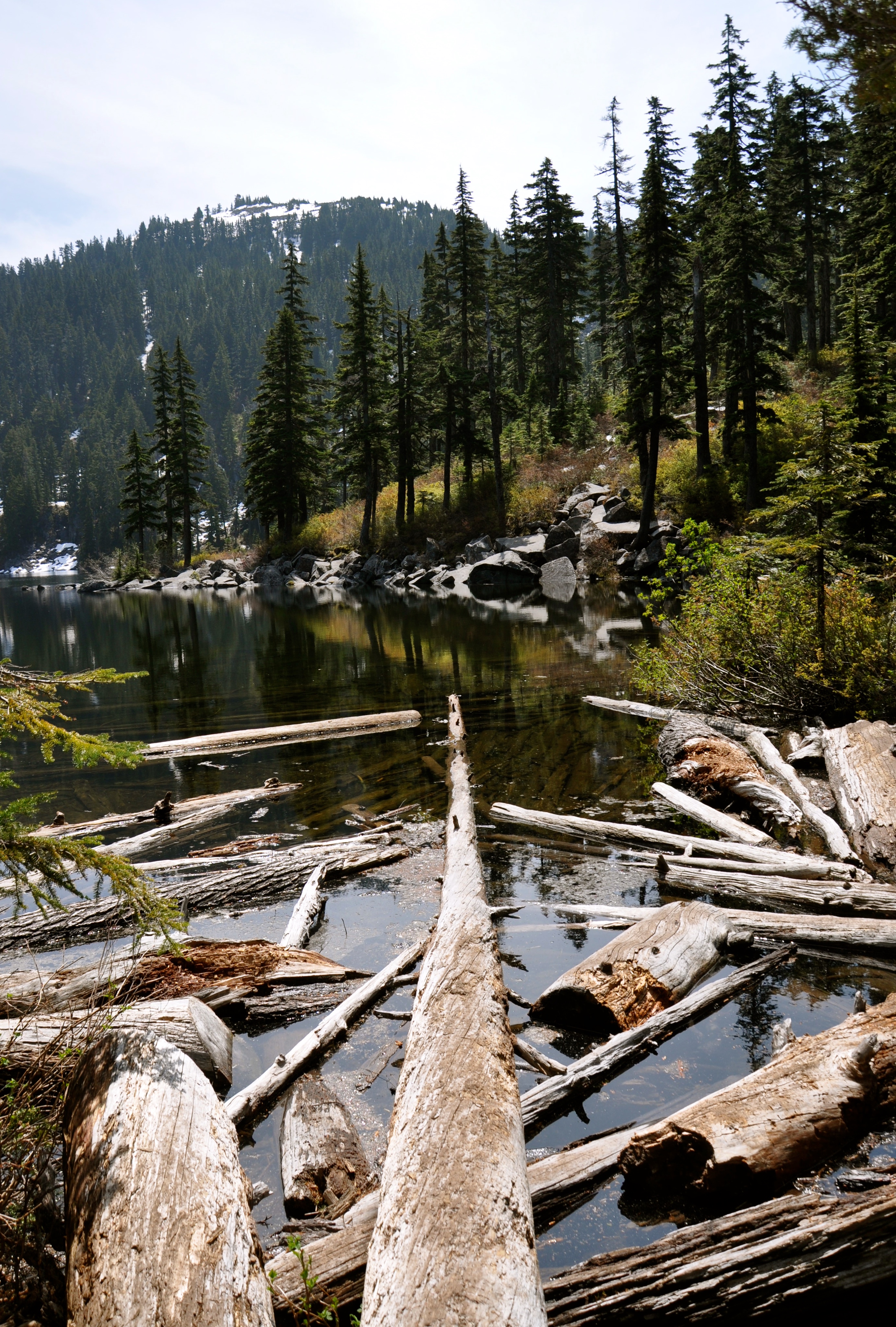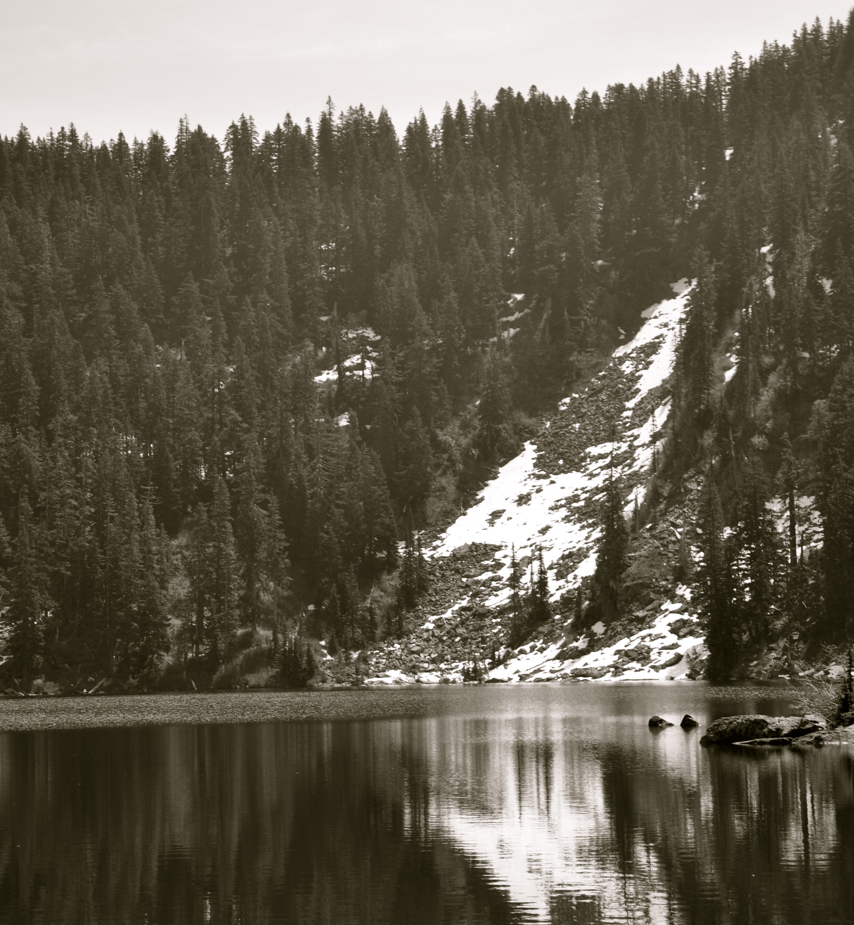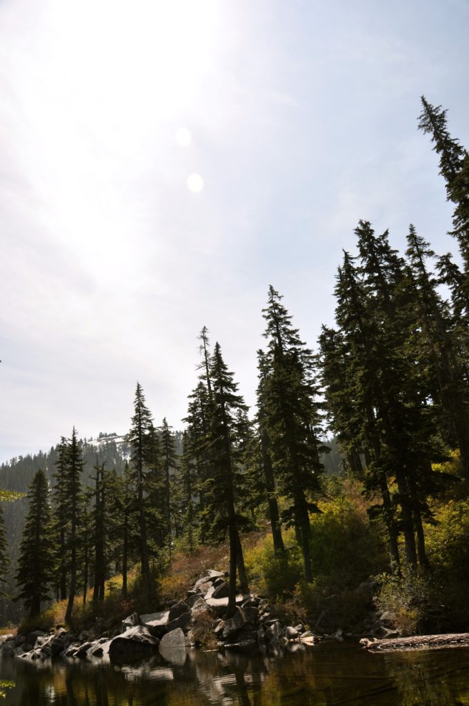 Mason Lake captivates even in the bright harshness of early afternoon sun. We had crested a 4,320 ft. high open rocky ridge a short time before dropping down the northern flanks back into forest before reaching the lake. Mason Lake sits in a bowl at about 4200 ft.