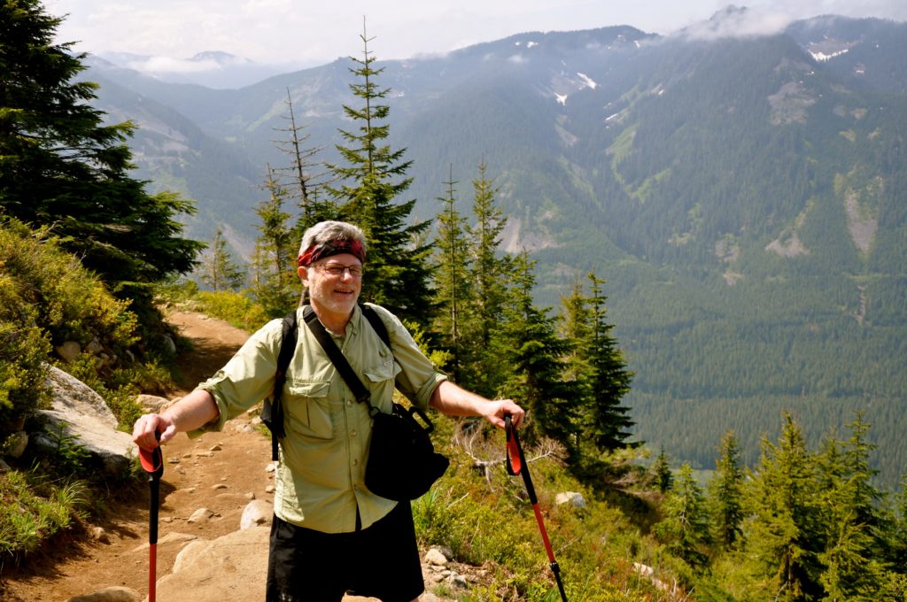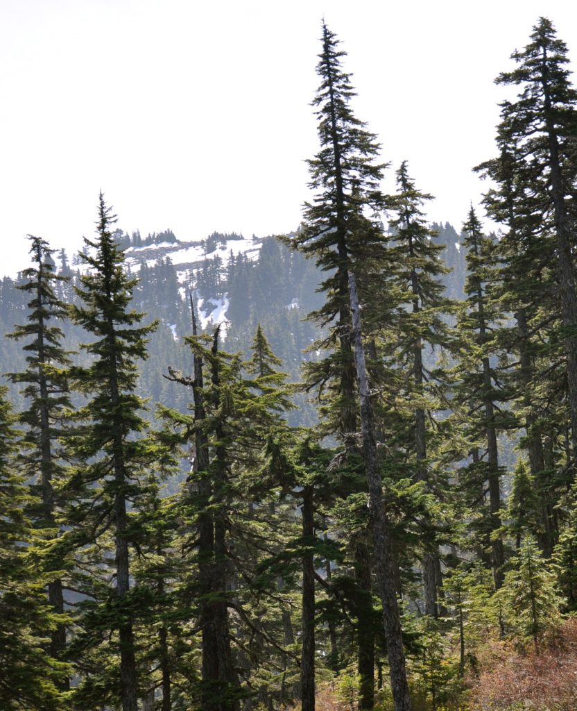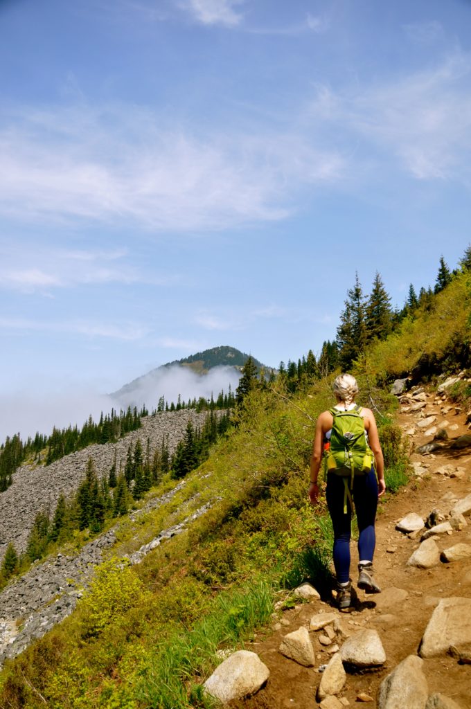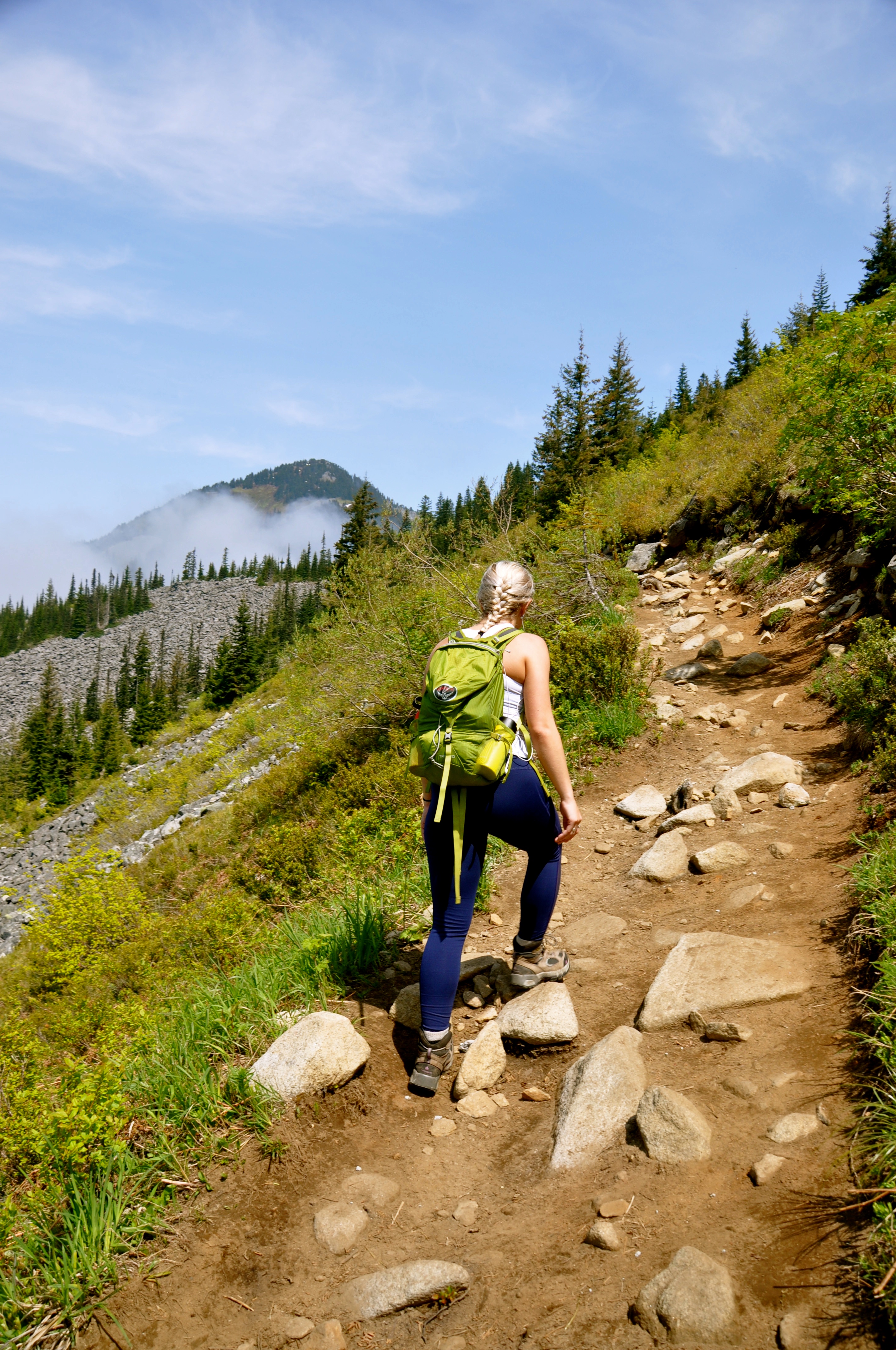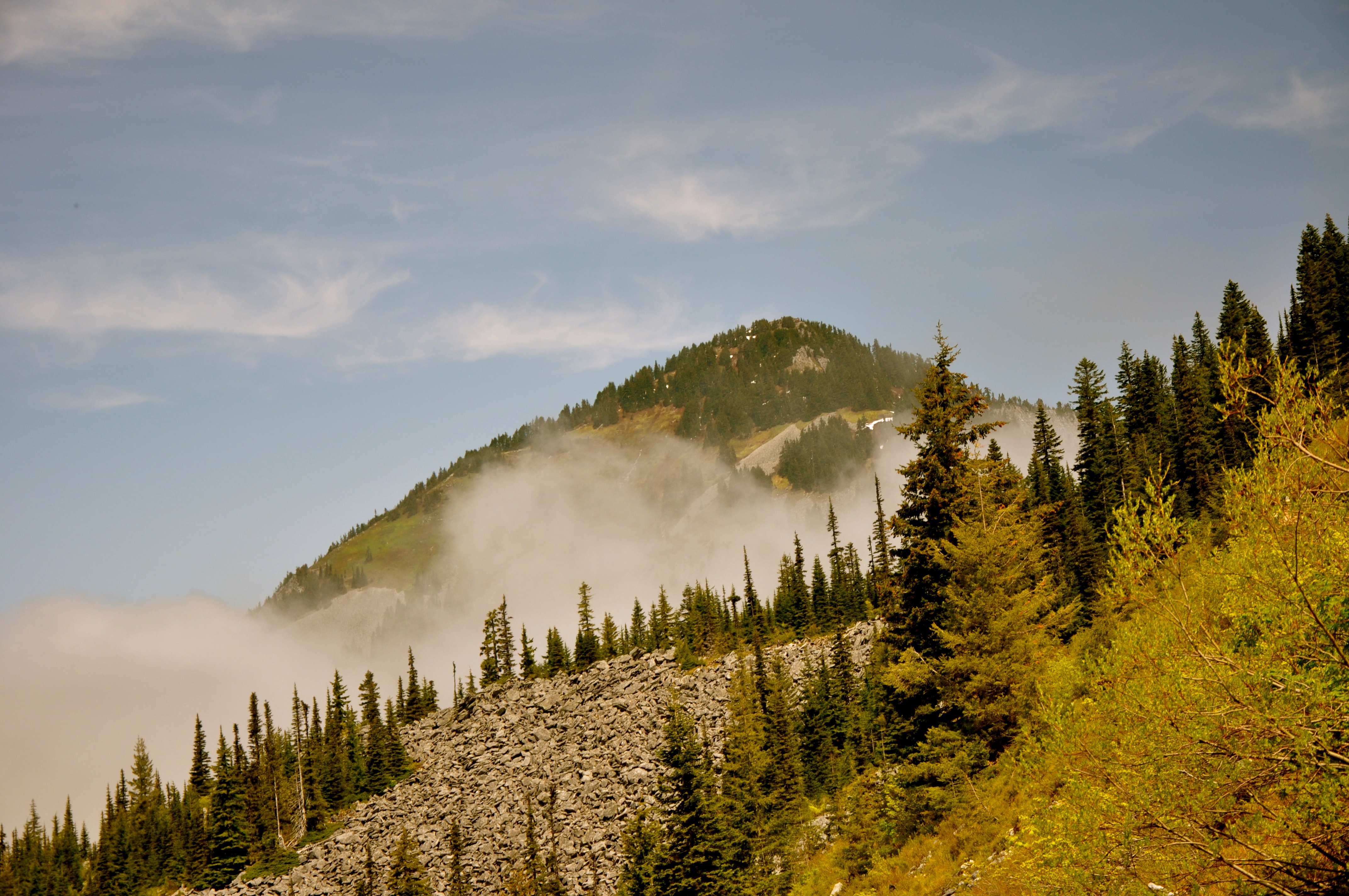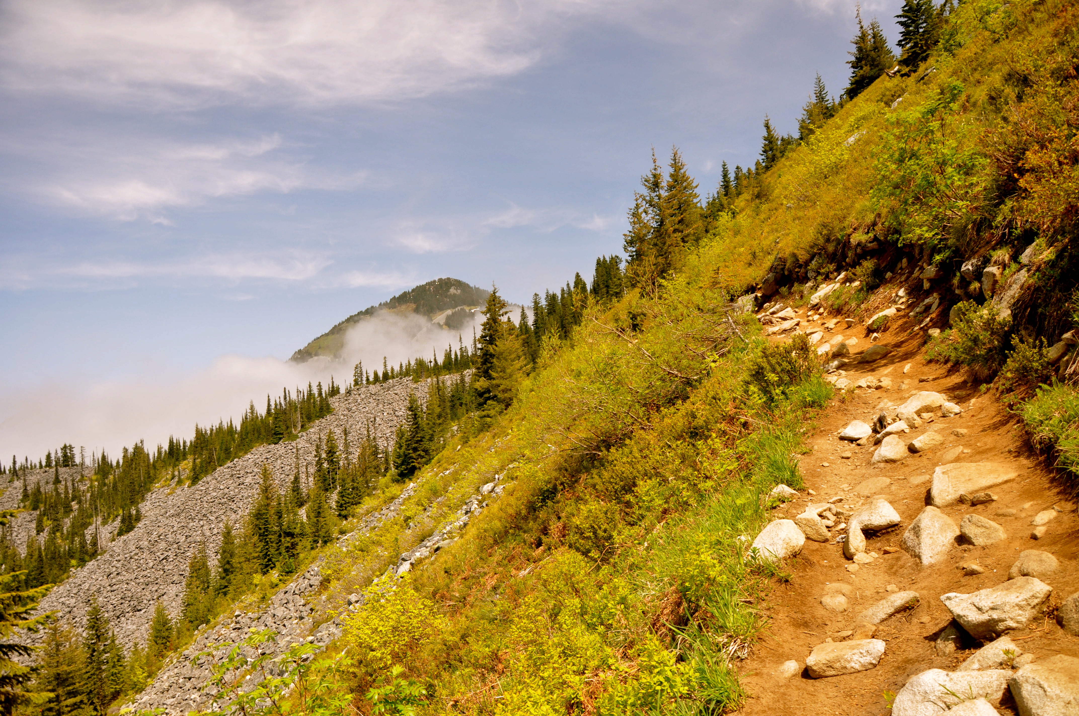 Cruising along the flanks of Bandera Mountain on the Ira Spring Memorial Trail towards Mason Lake. The tip of Mount Defiance peeks out of the morning fog ahead.