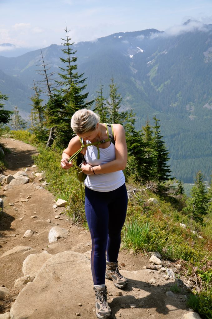 Kate about to head down after a sunrise breakfast at Hidden Lake Lookout (6,890 ft./2100+m.), Hidden Lakes Peaks, North Cascades, Sunday 30 June 2019. Foto by Madeleine w/ Kate’s fonecam.