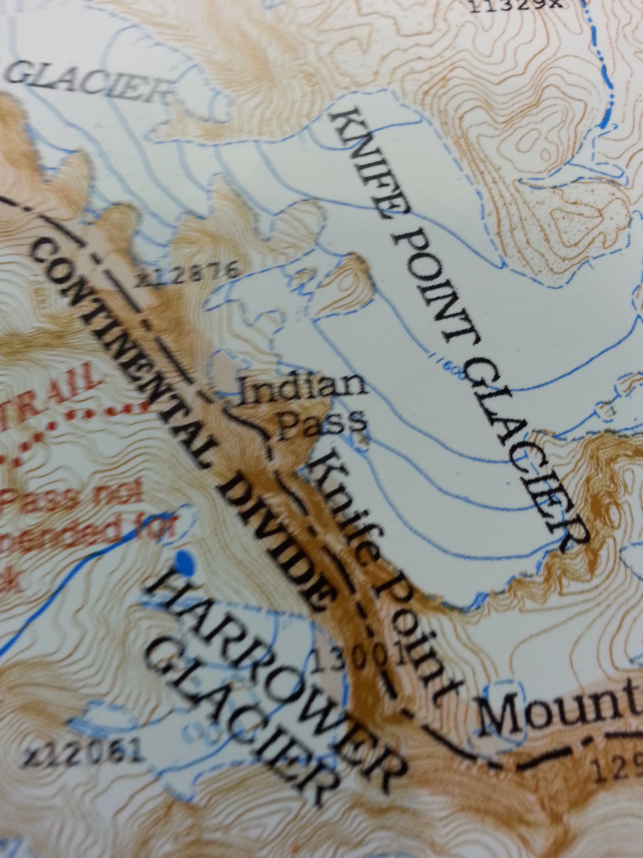 Zeroing in on a belated map of where we were upon the Bull Lake and Knife Point Glaciers, Indian Pass, and the unnamed peak jutting off the north end of Knife Point Ridge, the peak we named Iowa after one of our NOLS Instructor’s native state.