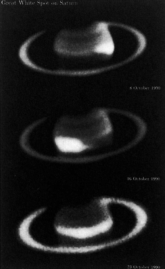 The Great White Dragon churns thru Saturn’s atmosphere as the occult planet’s rings form a scythe in this image from October 1990. From WikiMedia Commons via the European Southern Observatory, Creative Commons.