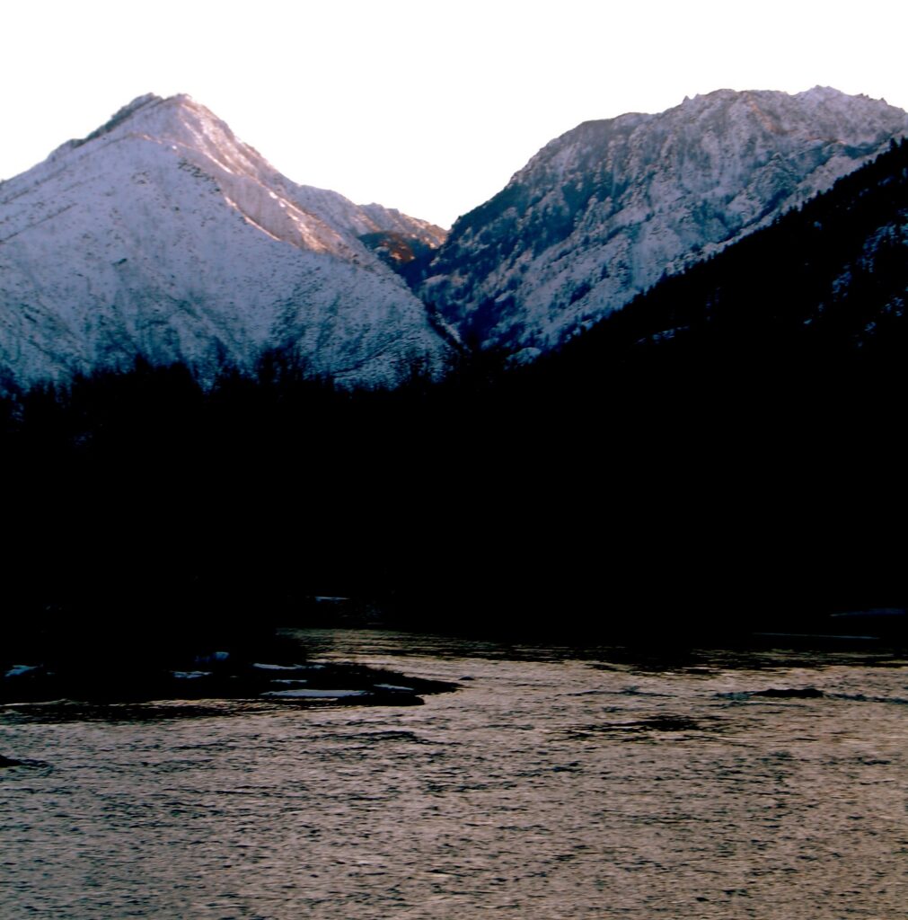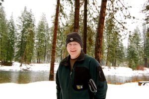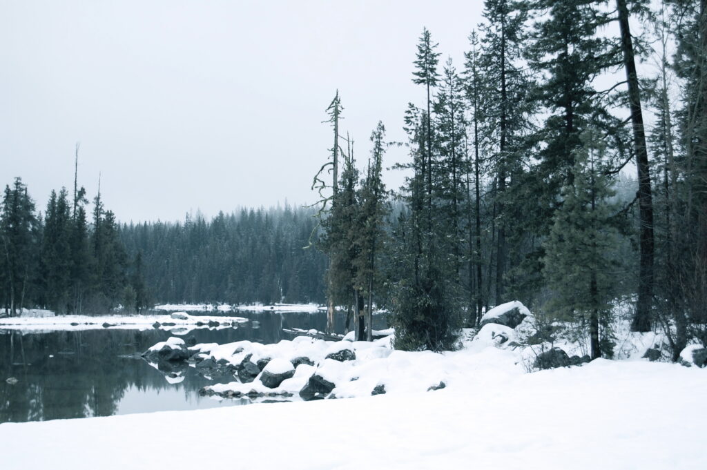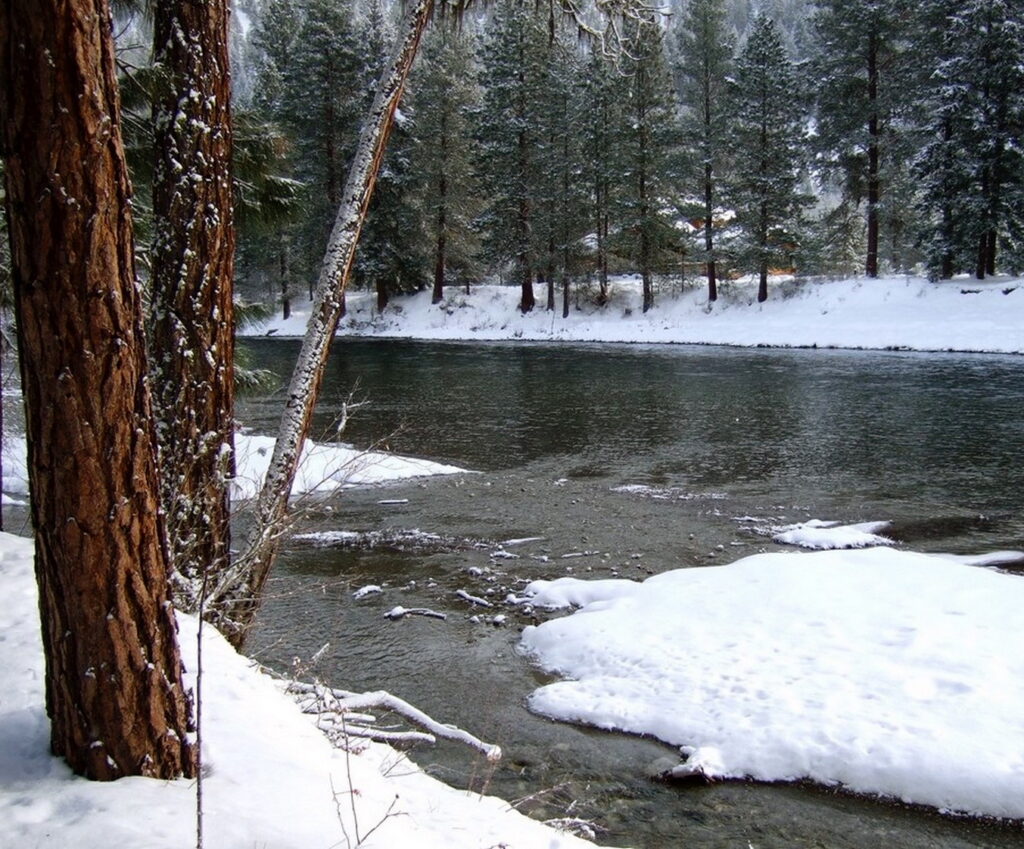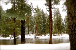 The Wenatchee River flows slowly thru the snowy forest. We’re both in awe of Nature’s beauty and power.