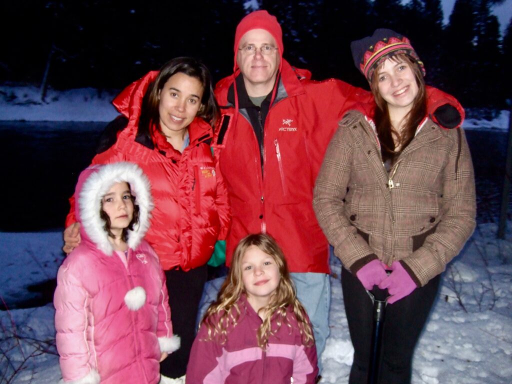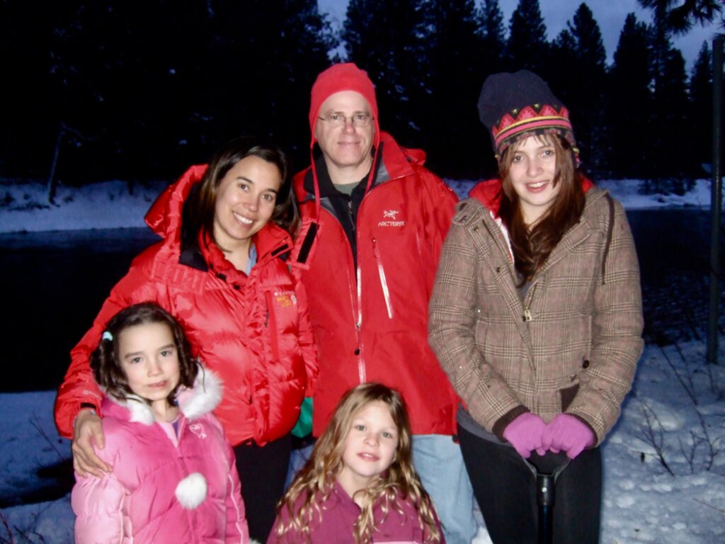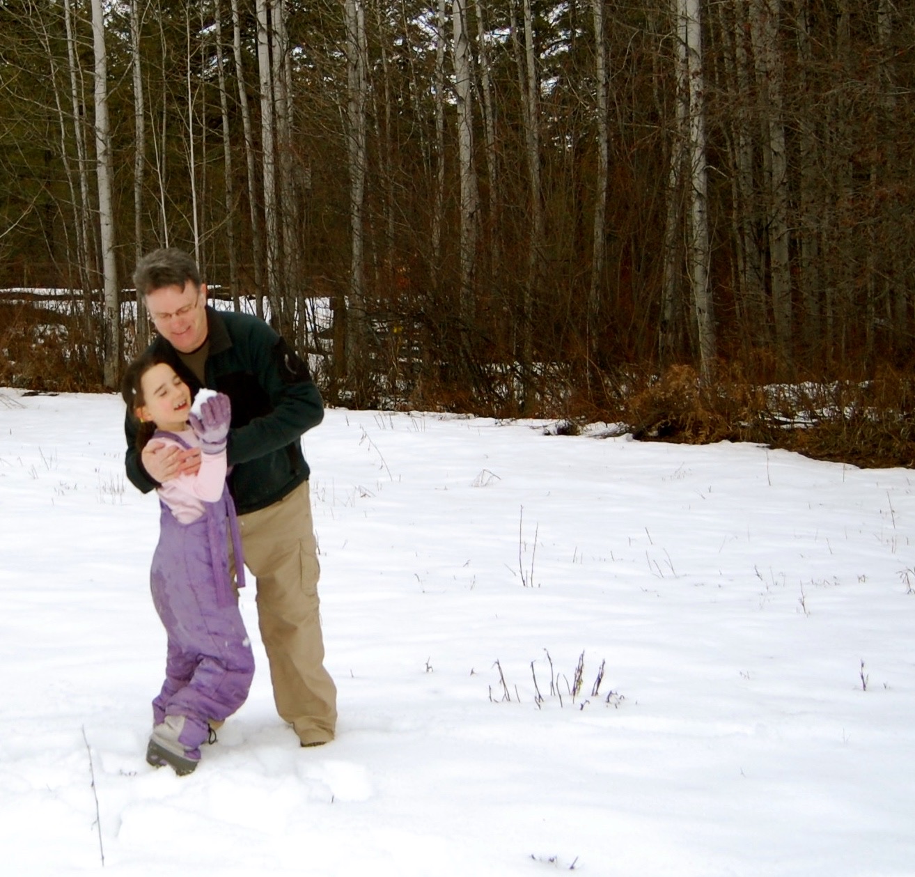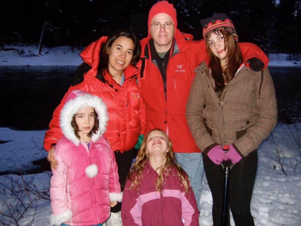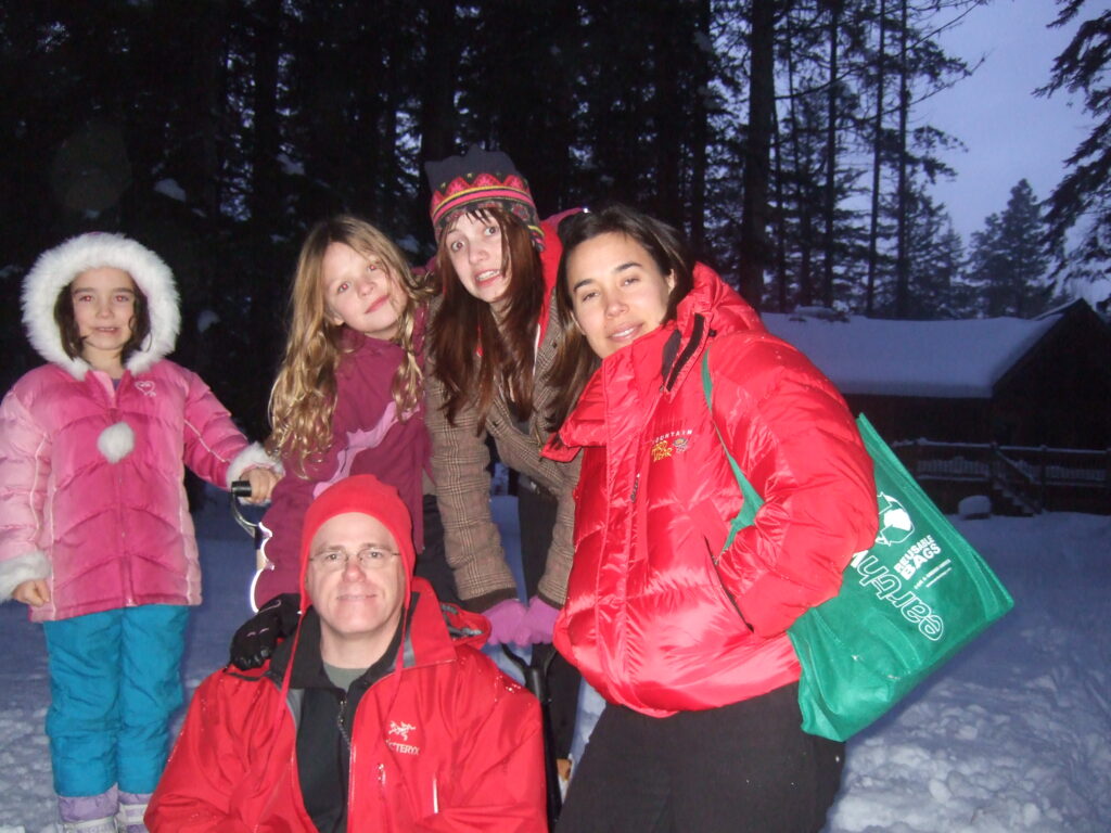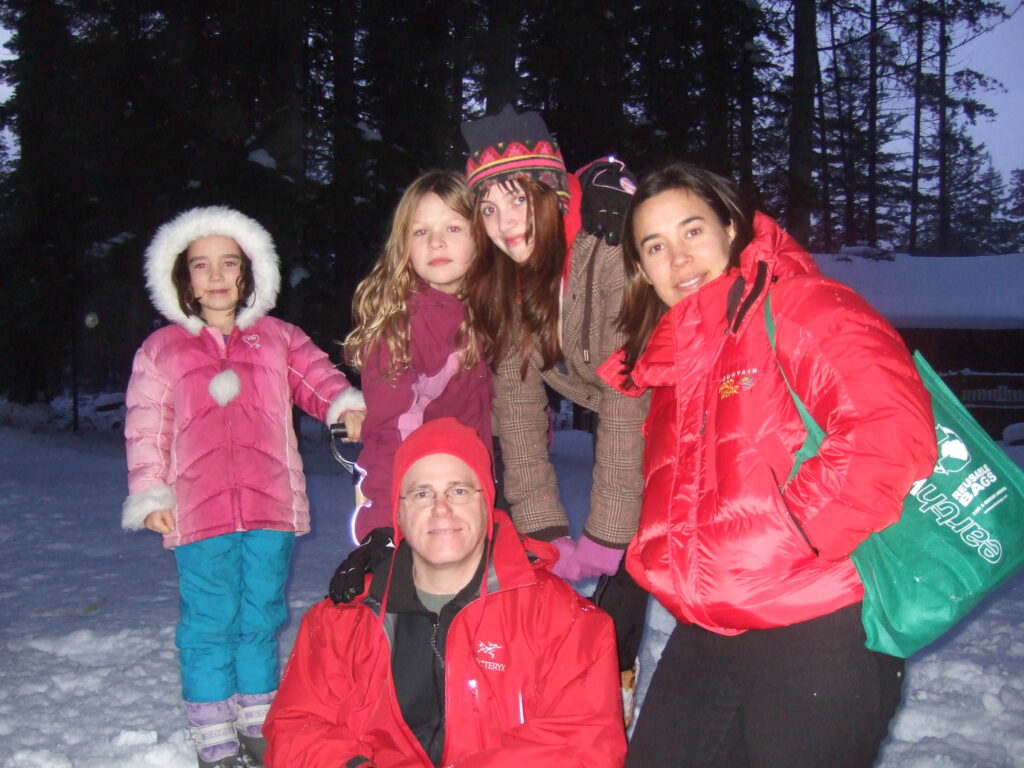 Blended family dynamics, y’all! Trying to get ourselves togerther for a family portrait by our comic genius Emily, one of my oldest daughter’s closest friends. I’m on my knees in the snow. Behind stand L2R: Talia, Kate, Morgan (now Dylan), & Kristina. Wednesday 16 January 2008.