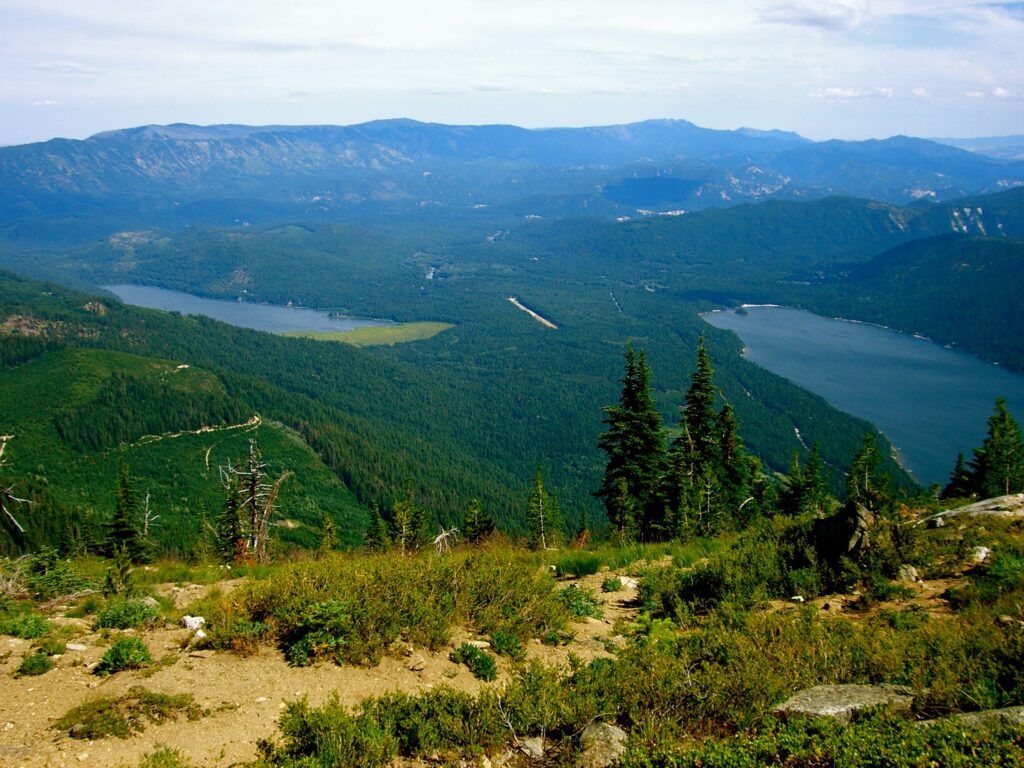 Gazing down the valley from the Dirtyface lookout. Fish Lake is on foto left and Lake Wenatchee on the right. The Wenatchee River flows out of the big lake. The state park curls around the lower end of the lake. The River House is hidden out of sight here on the other side of Natapoc Mountain, the low ridge in right of center in the picture.