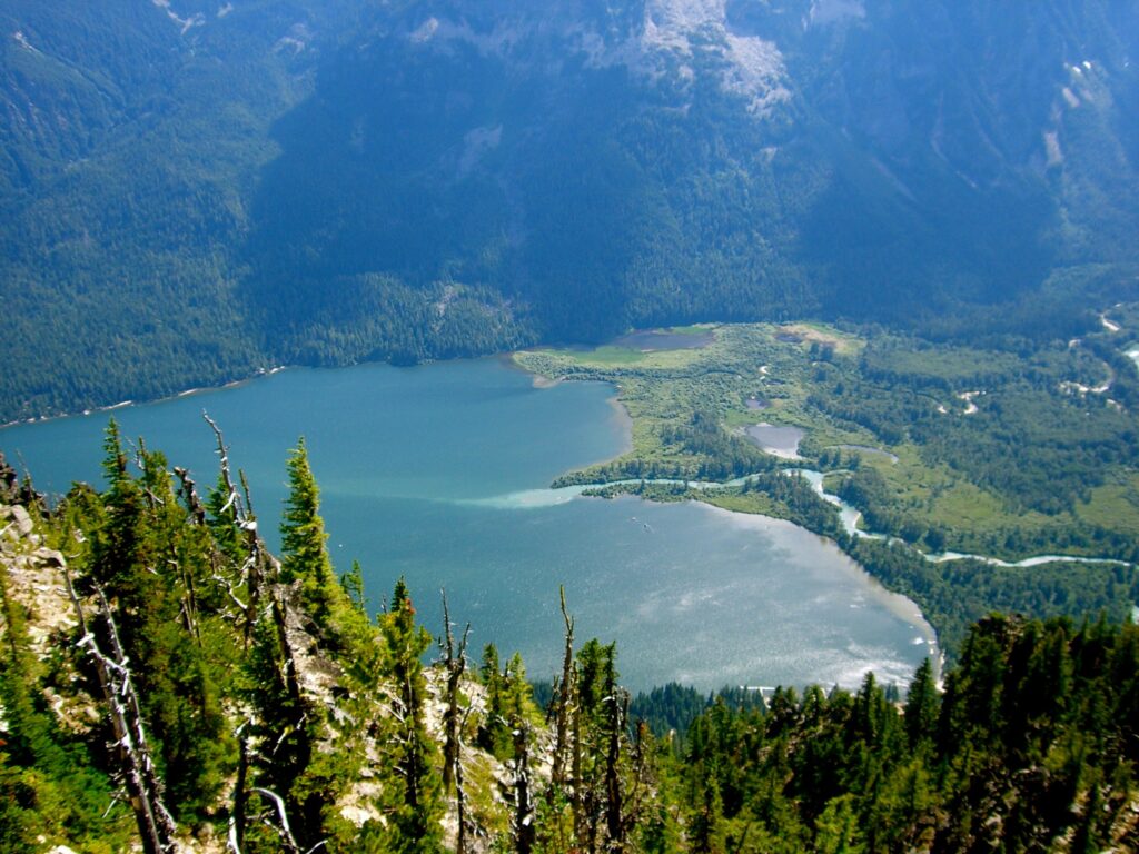 Looking down at the upper end of Lake Wenatchee and the Squaw Lake swamps in the delta formed by the White and Little Wenatchee Rivers as they flow into the lake. For the sharp eyes, one may see the beach me and the kids stood on earlier at Glacier View Campground. It’s on the far side of the lake left of center.